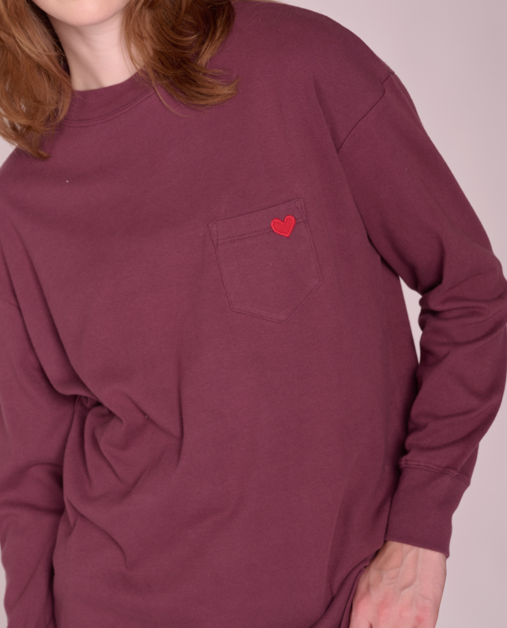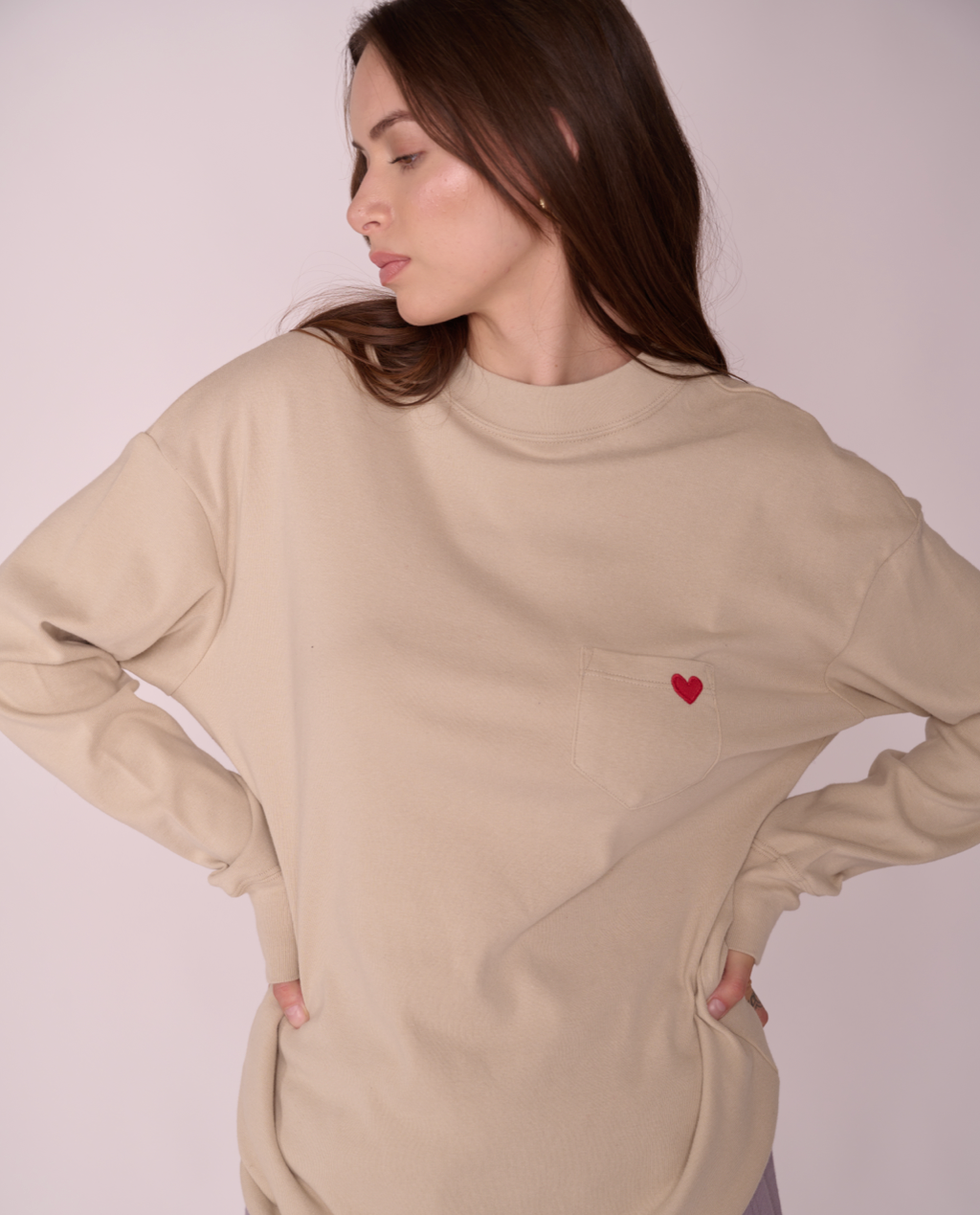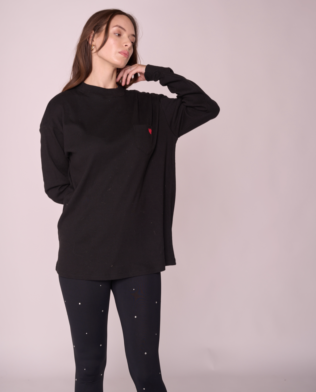Longline mock neck top with drop shoulder design, and features a front pocket with a red heart patch made with upcycled sweater.