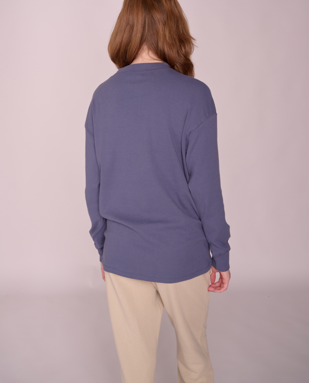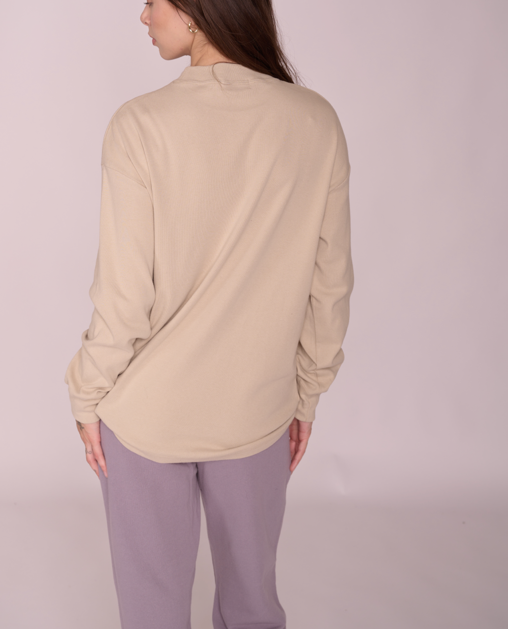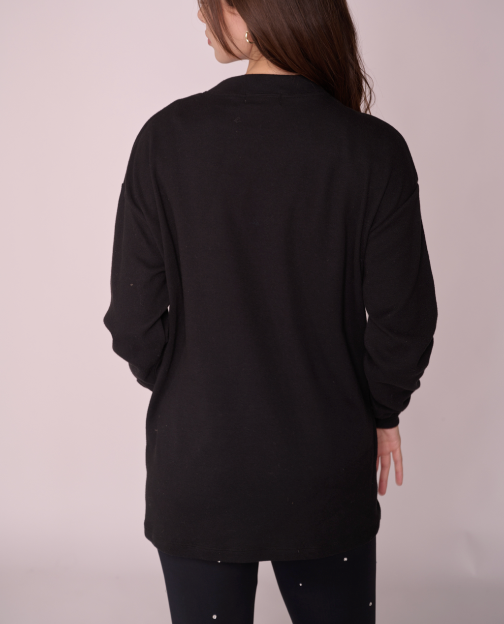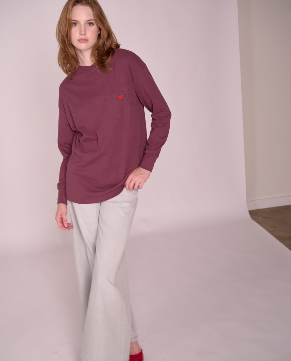 Longline mock neck top with drop shoulder design, and features a front pocket with a red heart patch made with upcycled sweater.
