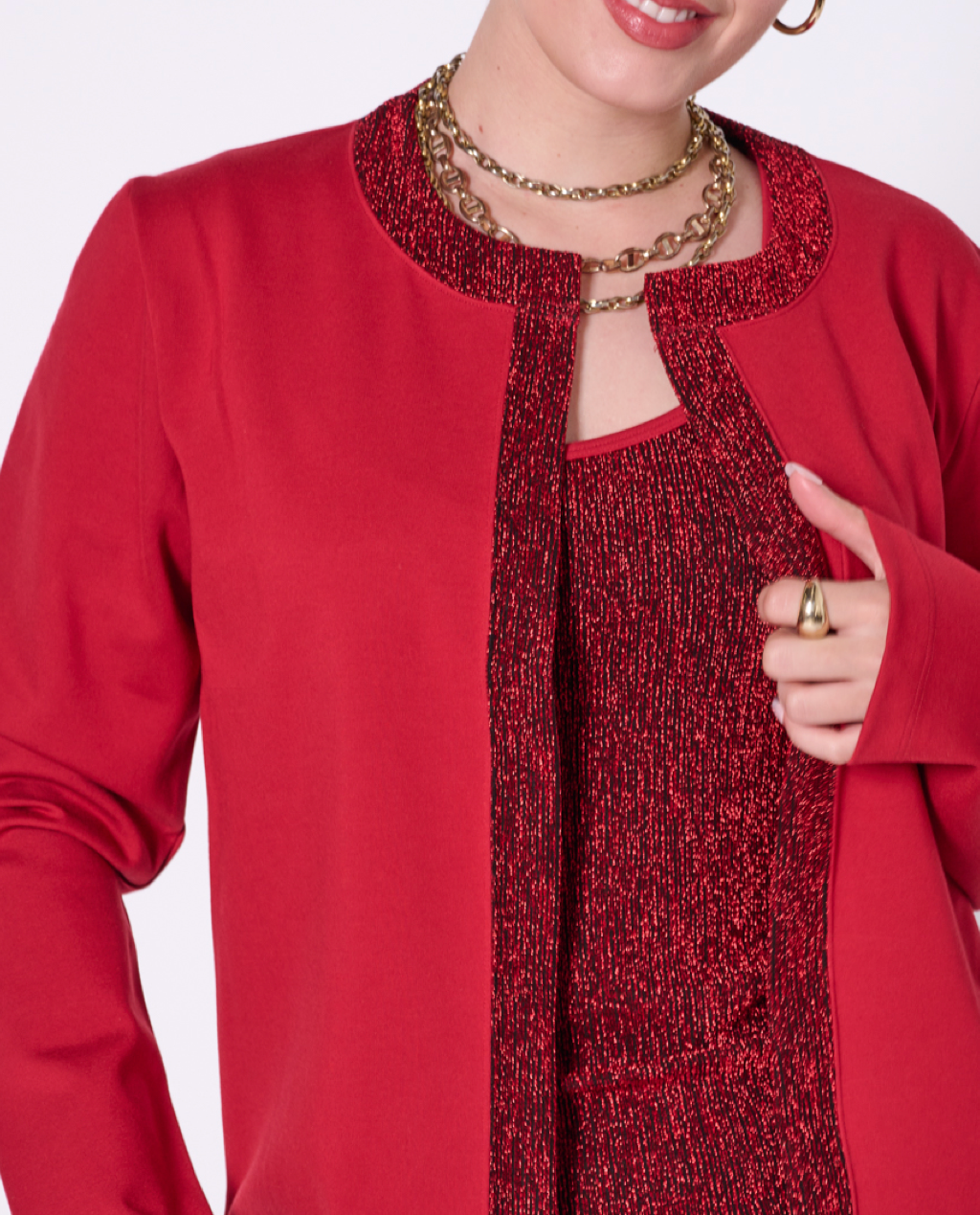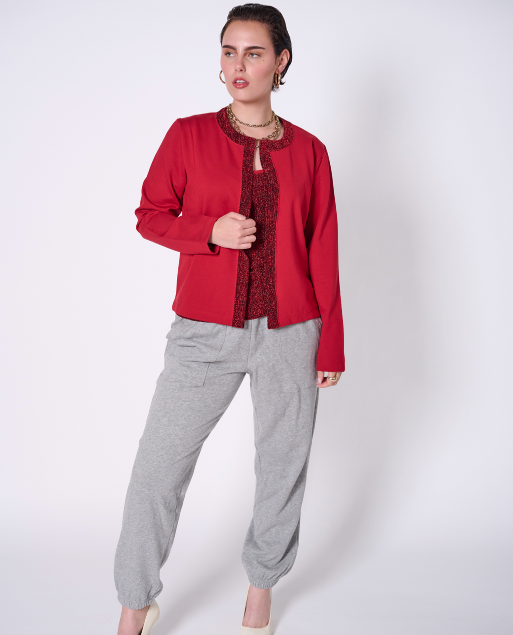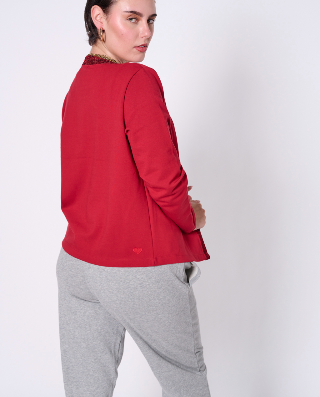 Collarless open jacket with metallic trim, and ponte body. Featuring our upcycled red heart patch on the back. Slightly cropped fit to wear with your favourite tank top trouser, perfect for a office to night out look.