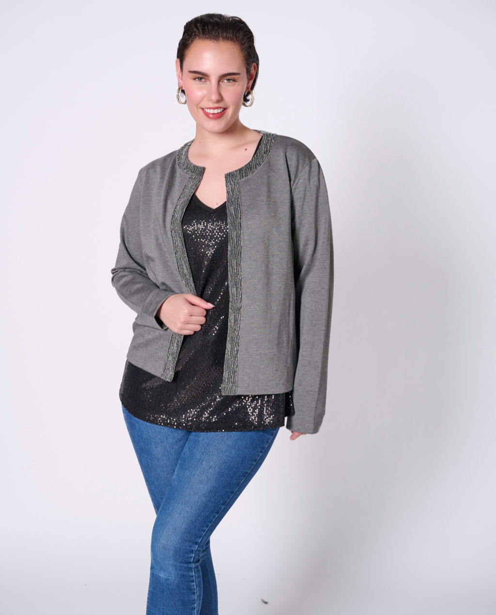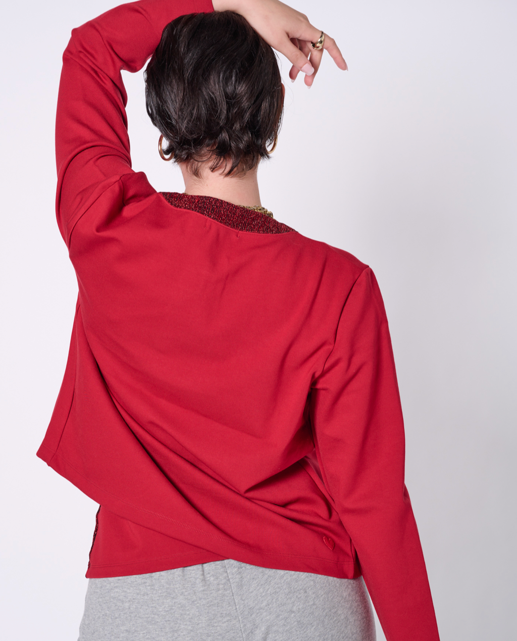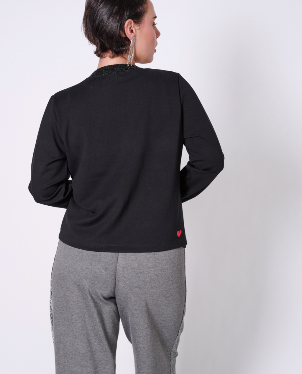 Collarless open jacket with metallic trim, and ponte body. Featuring our upcycled red heart patch on the back. Slightly cropped fit to wear with your favourite tank top trouser, perfect for a office to night out look.