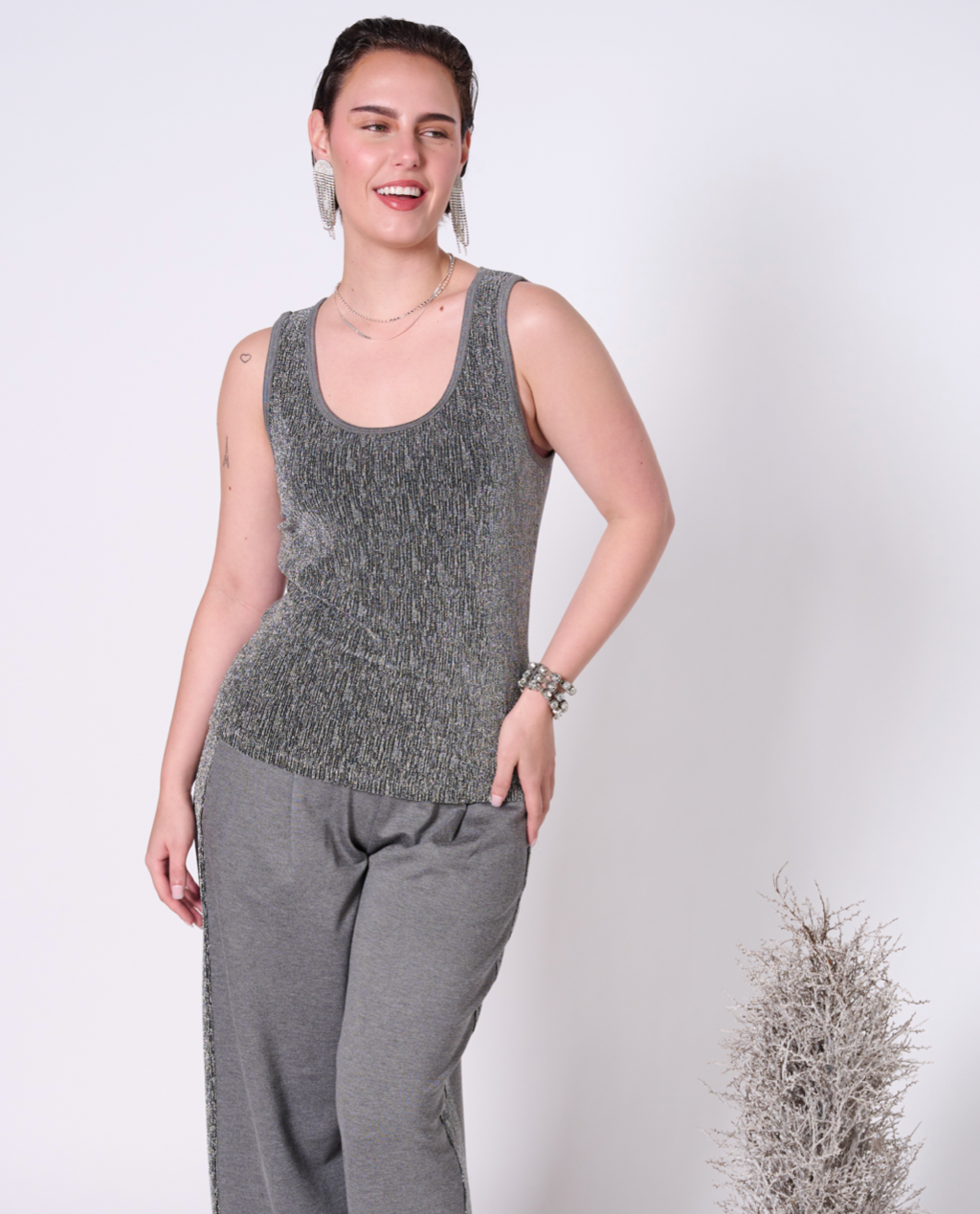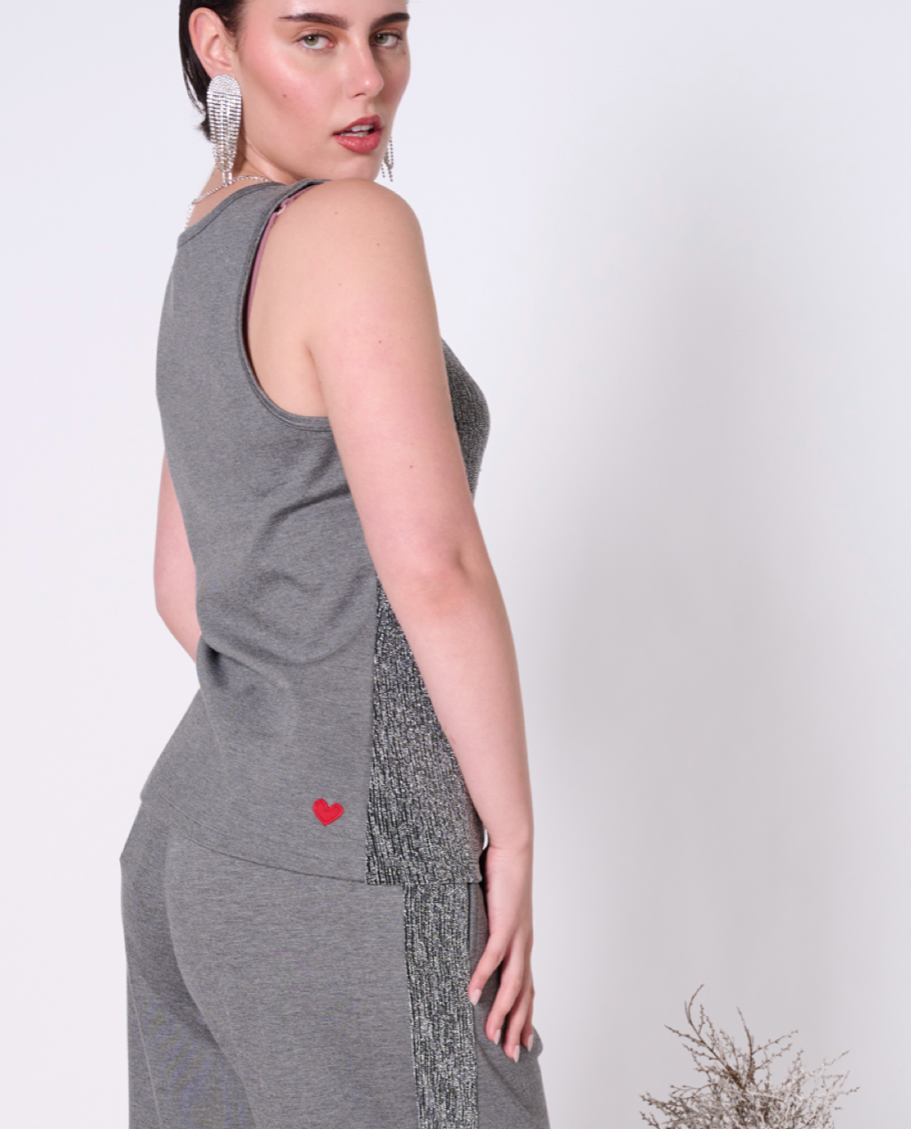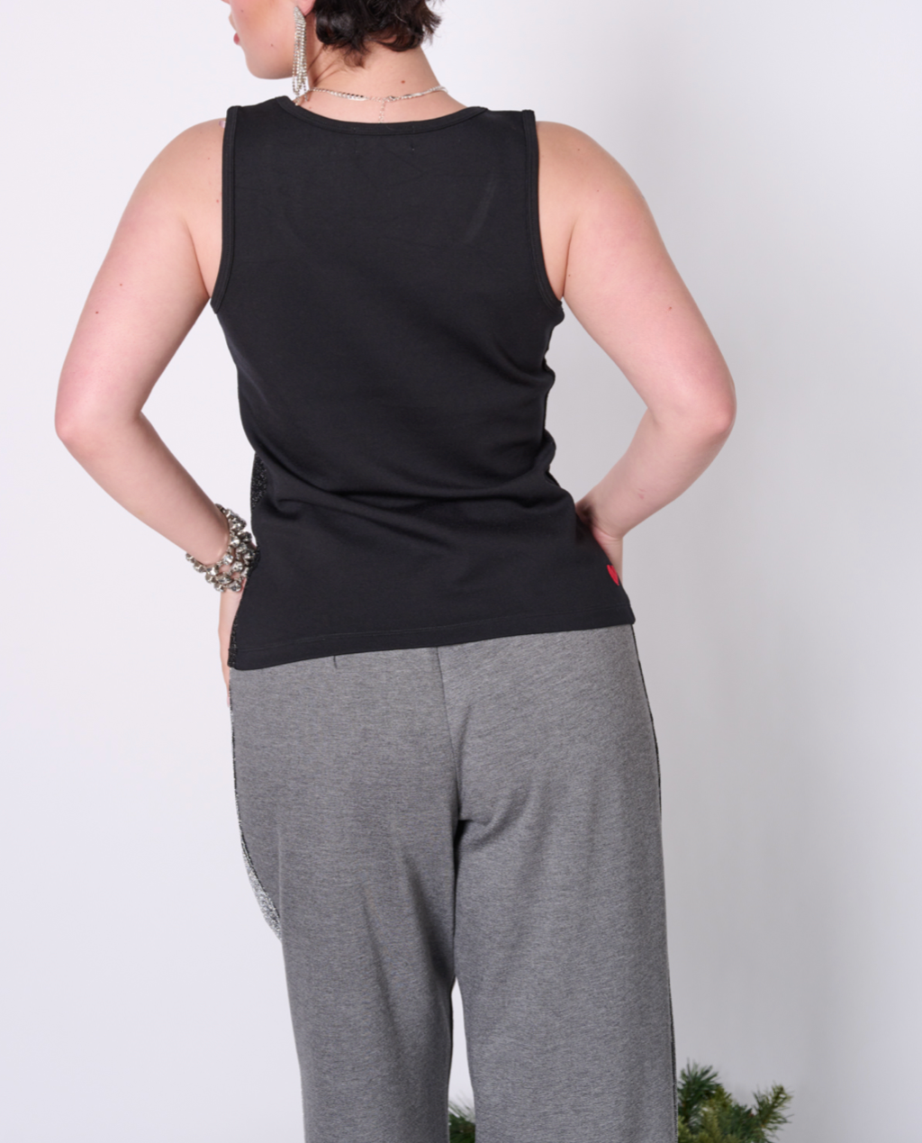 Fancy yet comfortable top with scoop neck. Luxurious metallic fabric in the front and stretchy ponte in the back. Perfect for layering or pairing with your favourite holiday dinner party bottoms. Featuring our upcycled red heart patch on the back.