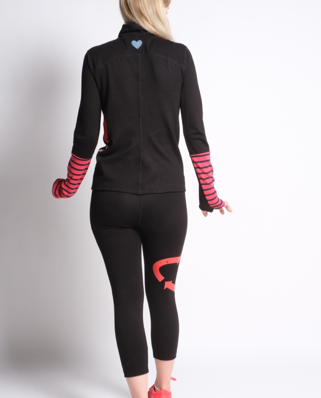 Stretchy workout top that hugs your body for warmth and feels soft to the touch on your skin. The top features a unique upcycled vintage stripe details on the sleeves and upcycled denim heart patch on the back.