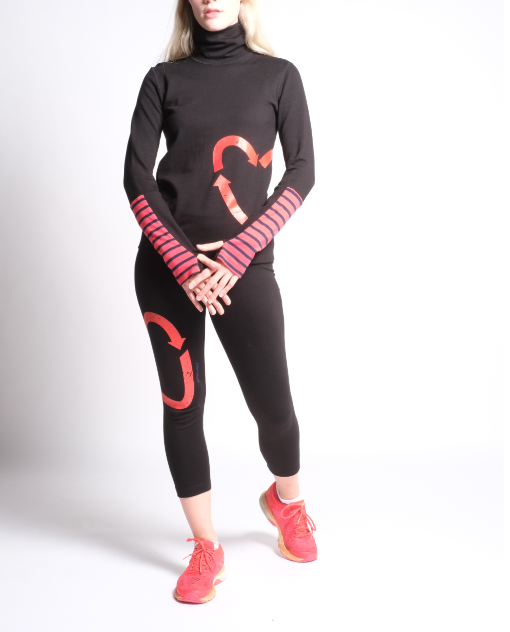 Stretchy workout top that hugs your body for warmth and feels soft to the touch on your skin. The top features a unique upcycled vintage stripe details on the sleeves and upcycled denim heart patch on the back.