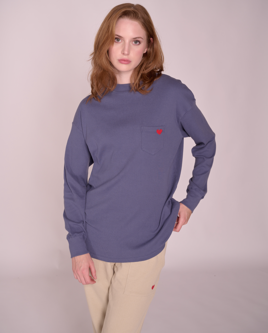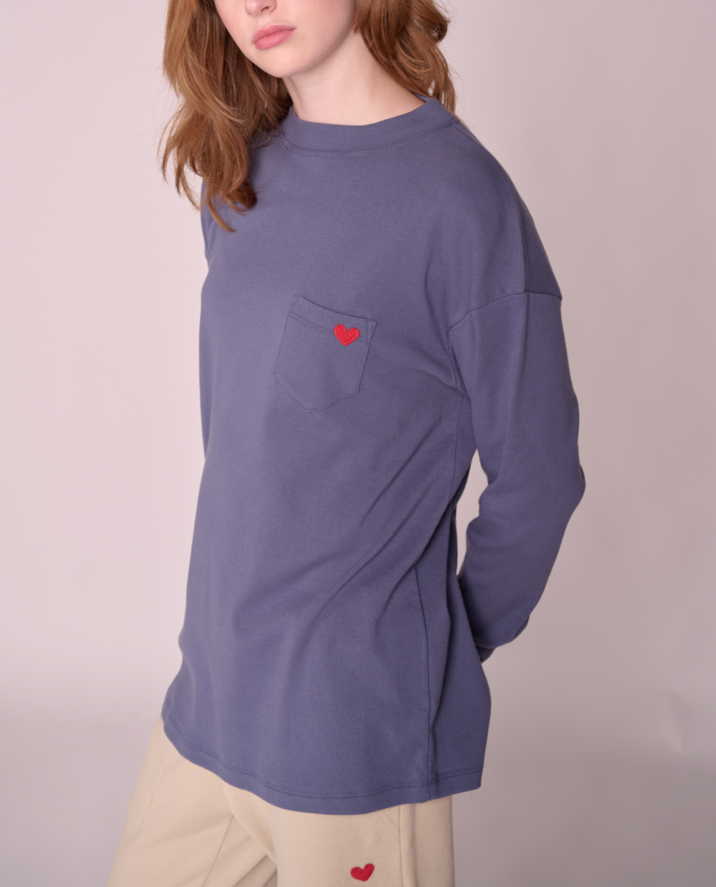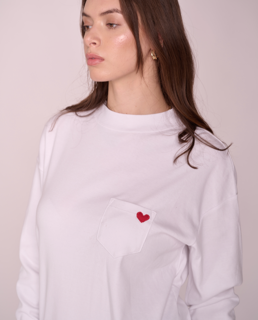 Longline mock neck top with drop shoulder design, and features a front pocket with a red heart patch made with upcycled sweater.