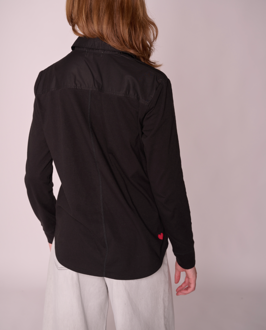 The most comfortable and versatile button up shirt you'll ever have! Made with 100% cotton poplin and soft jersey fabric on the sleeves and back panels. Perfect for layering under your favourite blazers, wearing as a simple and elegant top or even as an overshirt over a tank top!