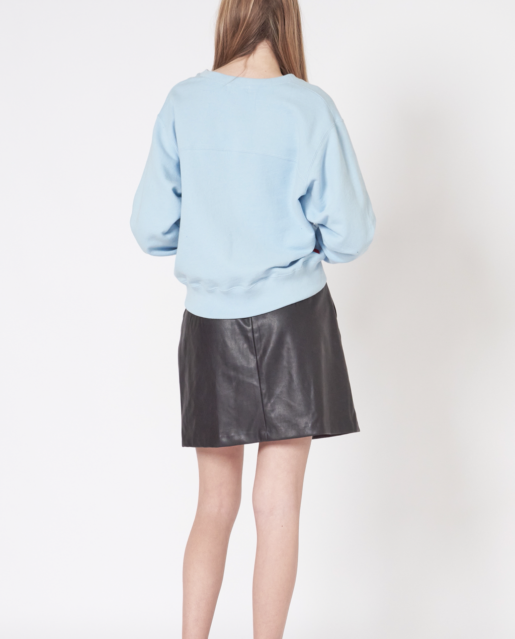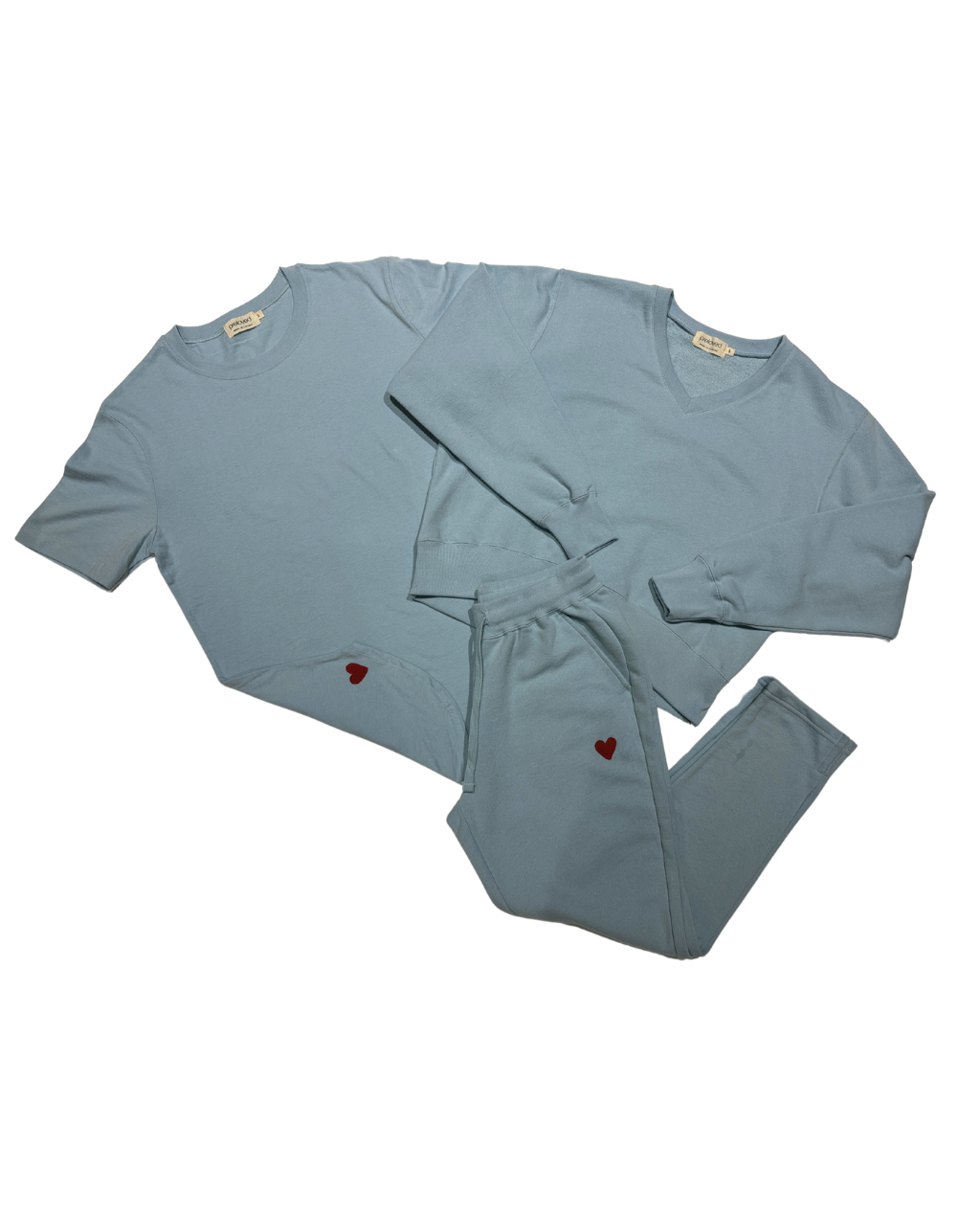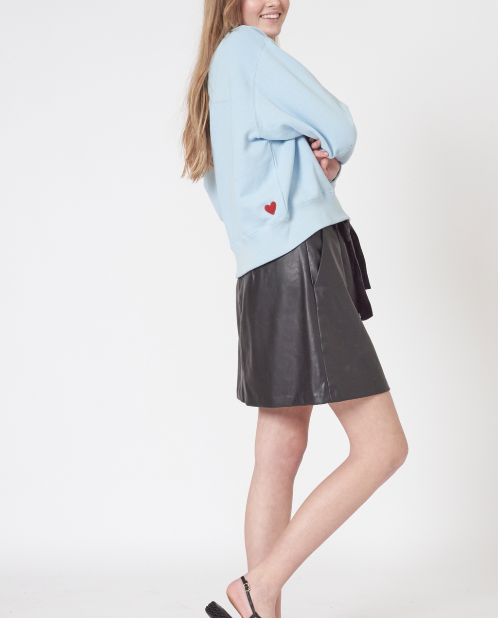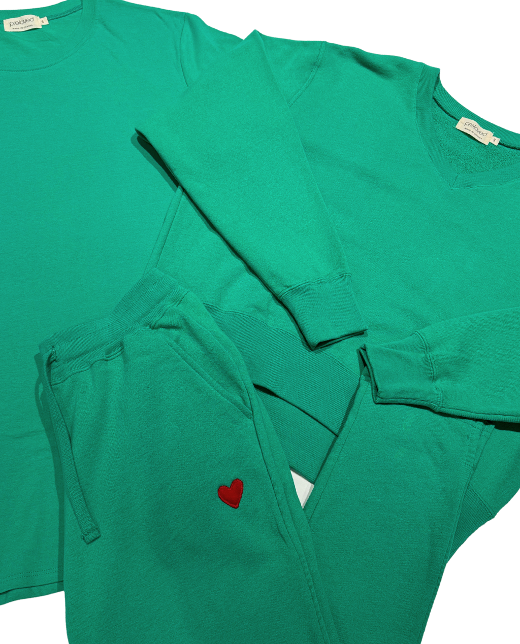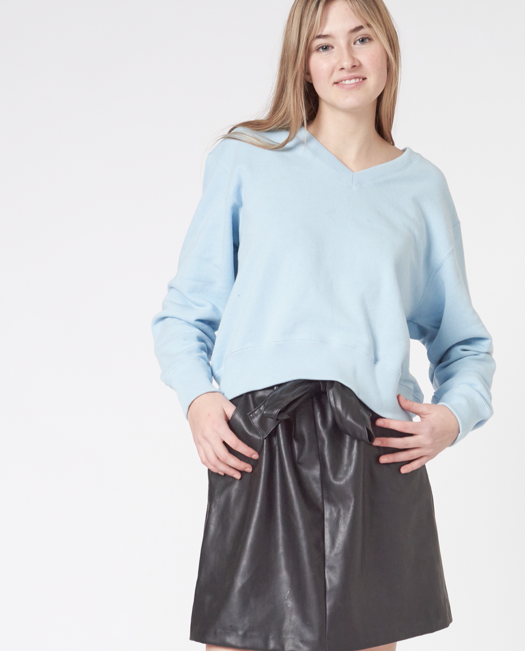 Slightly cropped sweatshirt with V-neck. Made with 100% cotton terry (50% recycled yarn and 50% in normal yarn). Featuring the upcycle red heart patch on the back.