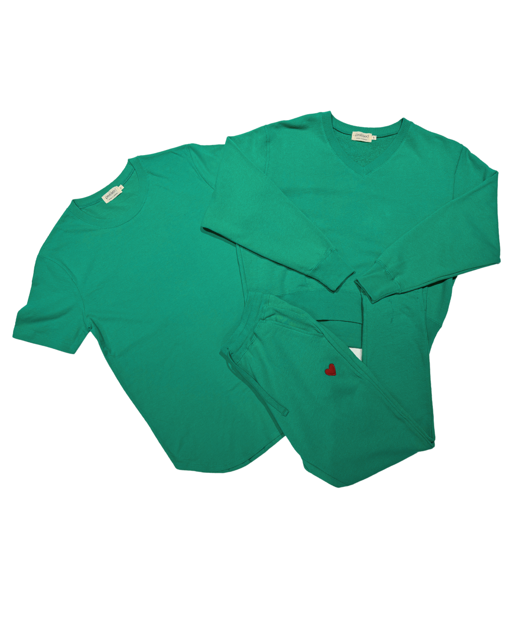 Slightly cropped sweatshirt with V-neck. Made with 100% cotton terry (50% recycled yarn and 50% in normal yarn). Featuring the upcycle red heart patch on the back.