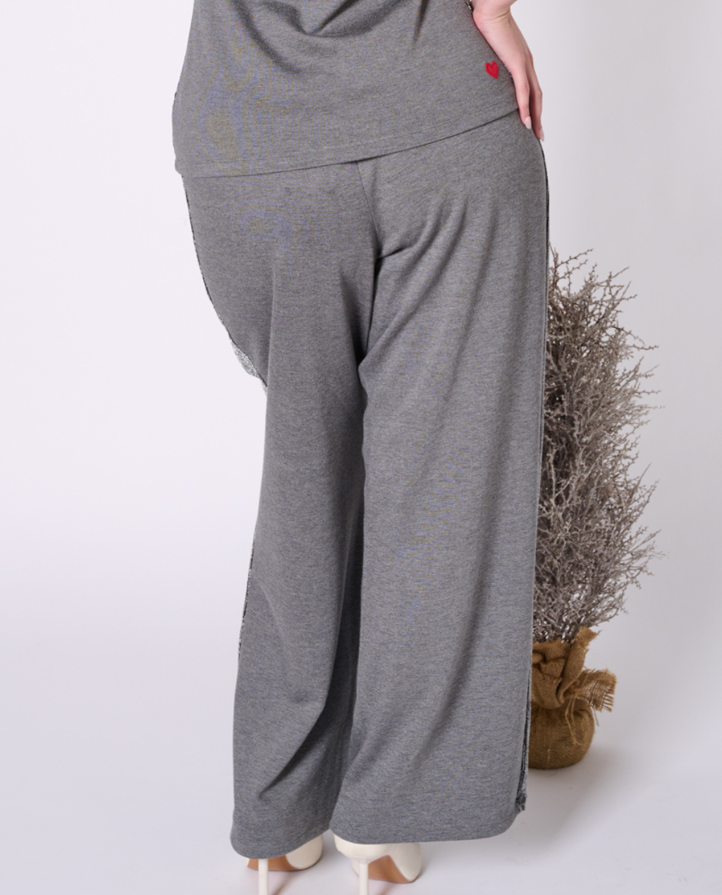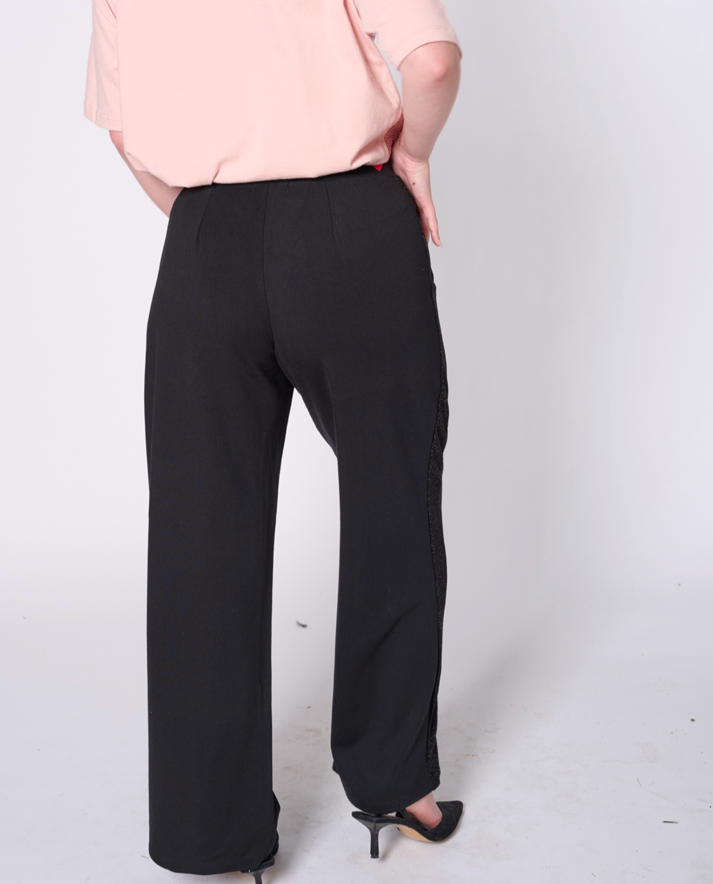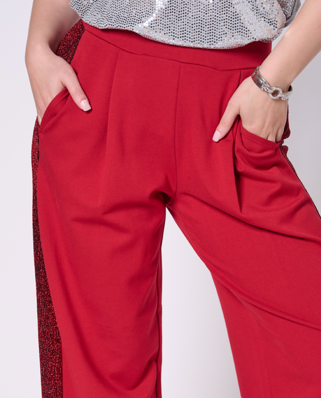 Tailored trouser inspired pants, wiith a pull-on stretchy fit but a refined look, and functional pockets. With a metallic racing stripe down the sides, ponte body. Featuring our upcycled red heart patch on the back.