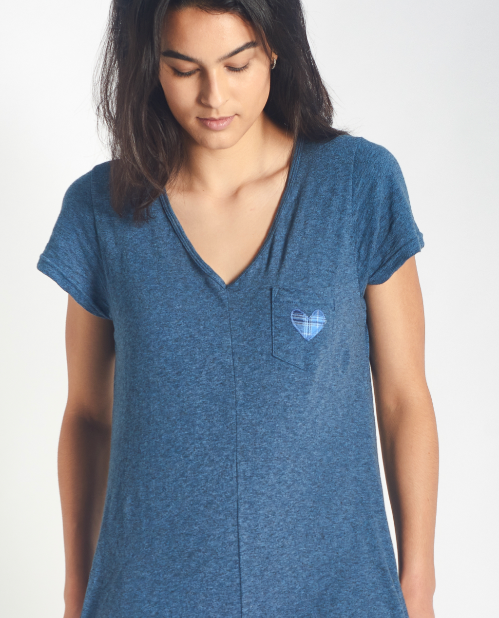 Cozy and perfect for a casual outfit or staying at home by the fire. V-neck 100% cotton slub jersey jumpsuit with a relaxed fit. Features plaid or red heart appliqué on the front pocket.