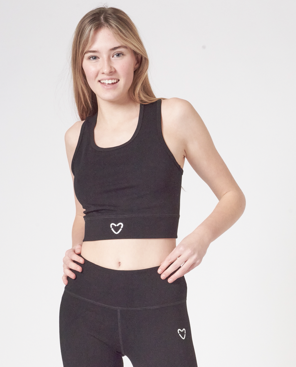 High coverage fitting top, constructed from ponte - inside yoke made with upcycled striped tee and features upcycled denim heart appliqué and recycled heart screenprint.