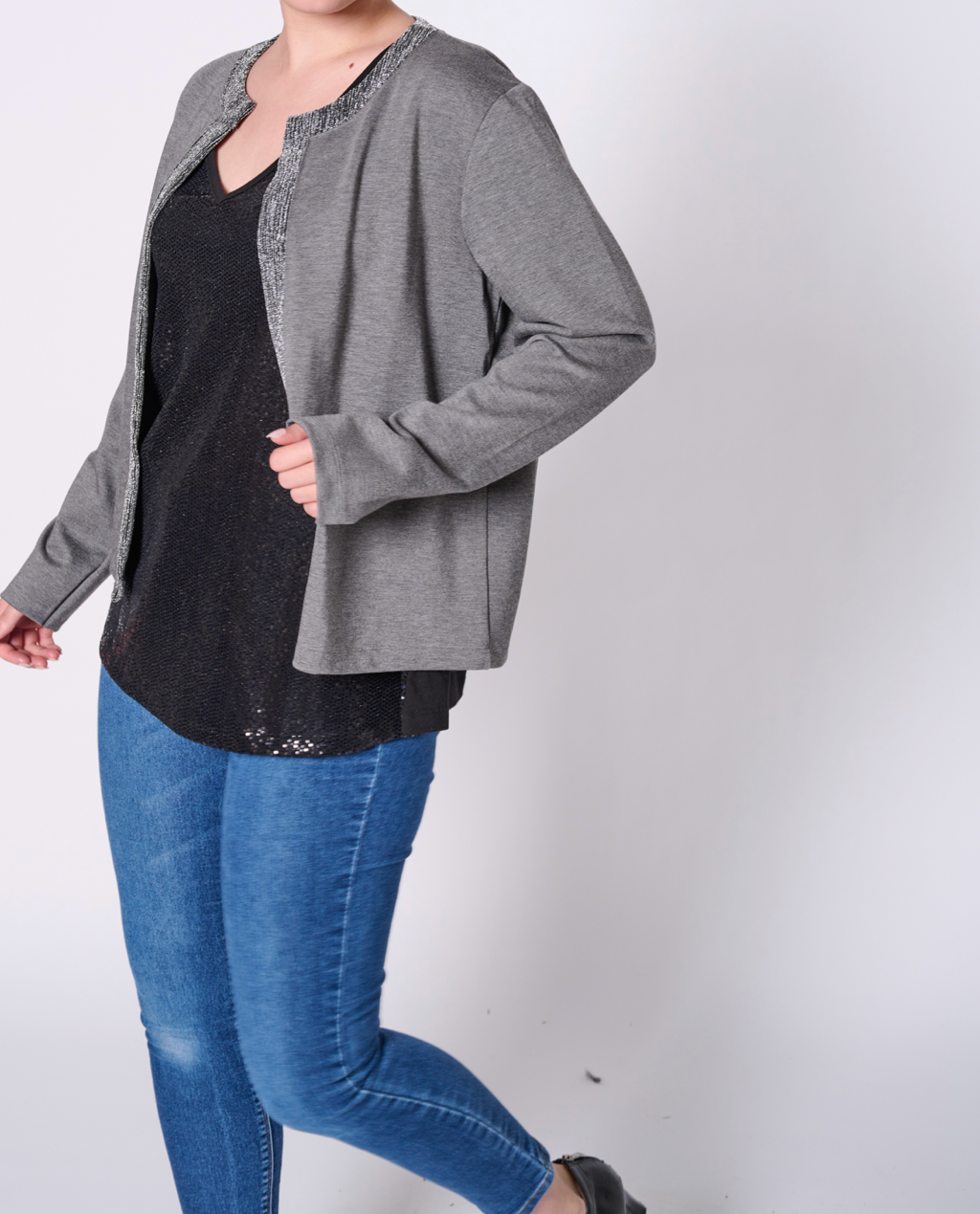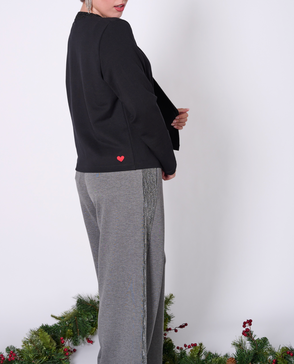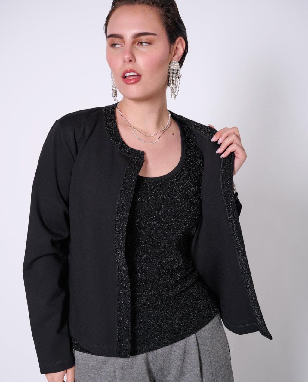 Collarless open jacket with metallic trim, and ponte body. Featuring our upcycled red heart patch on the back. Slightly cropped fit to wear with your favourite tank top trouser, perfect for a office to night out look.
