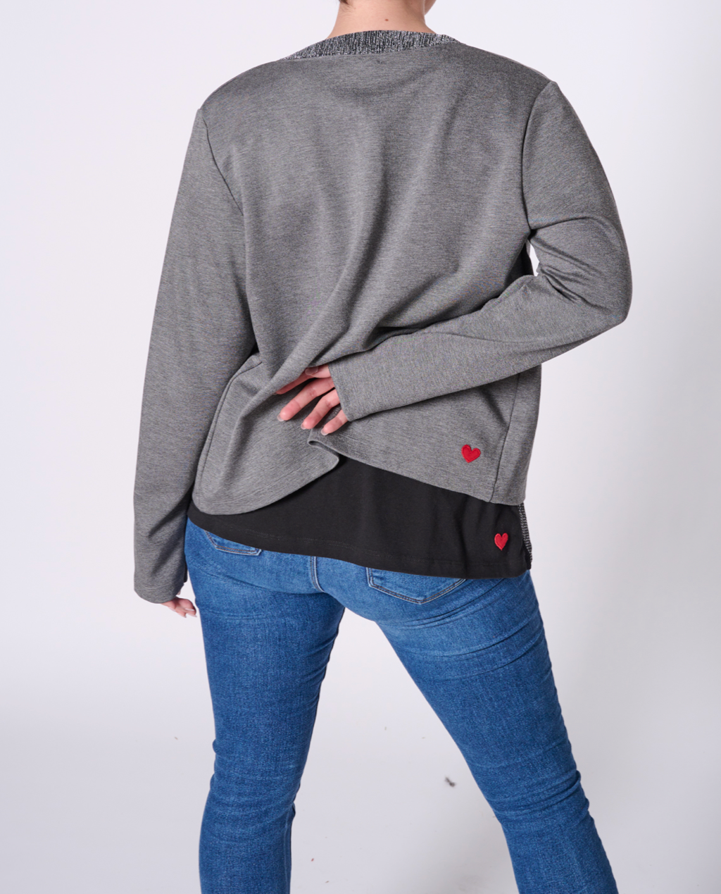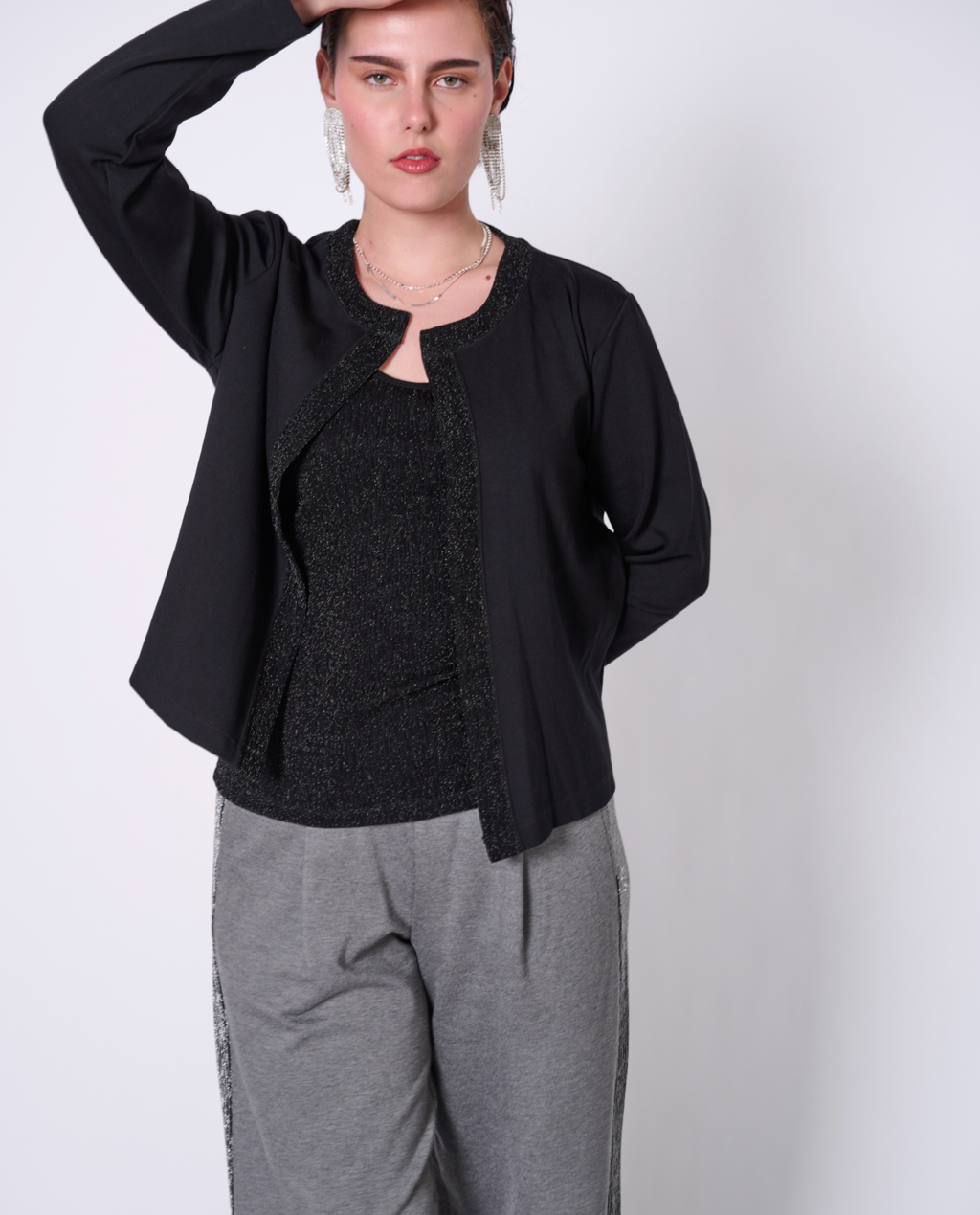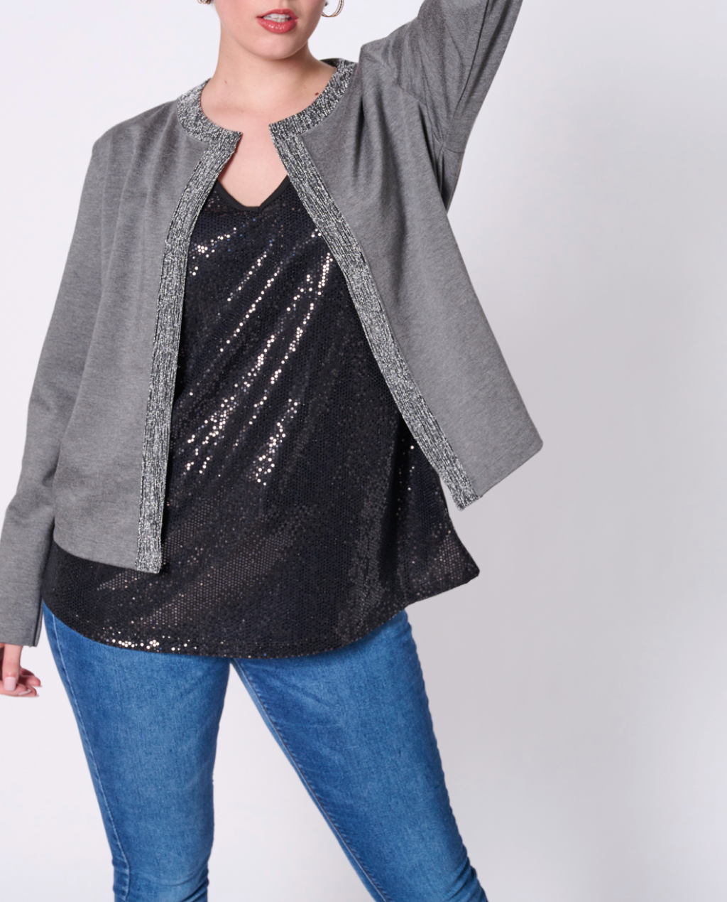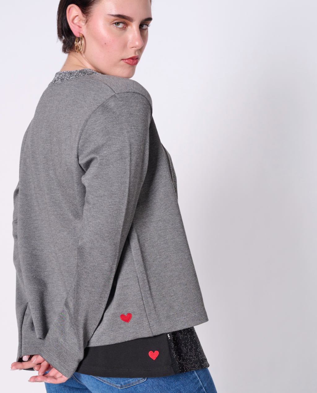 Collarless open jacket with metallic trim, and ponte body. Featuring our upcycled red heart patch on the back. Slightly cropped fit to wear with your favourite tank top trouser, perfect for a office to night out look.