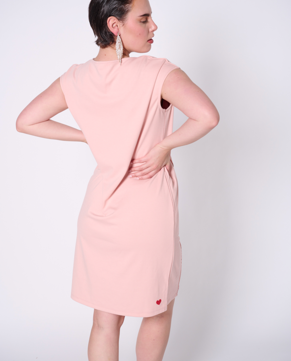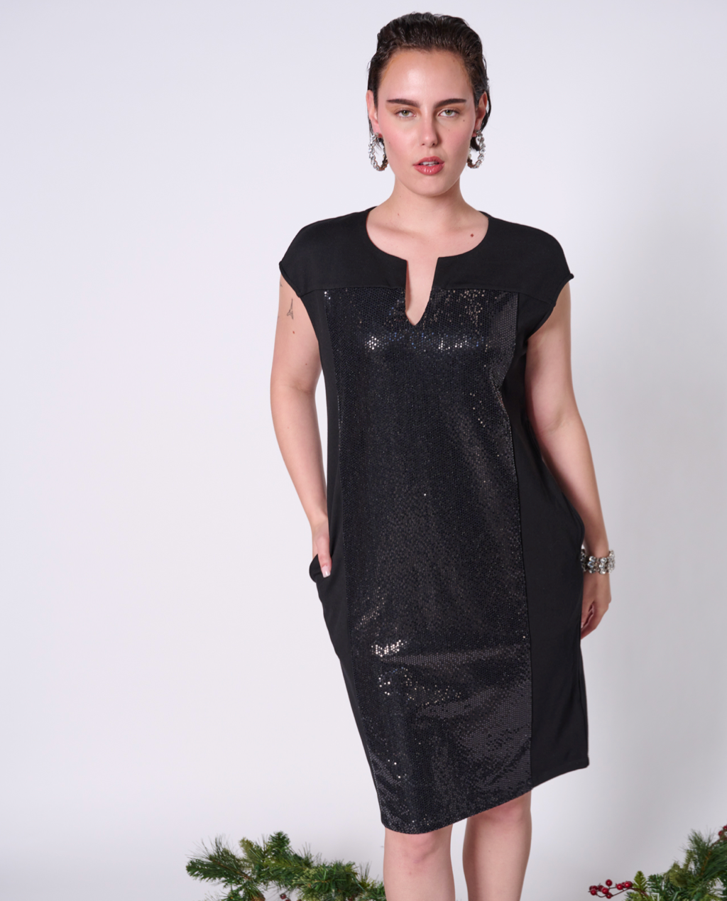 Cap sleeve shift dress with a slit neckline. Featuring sequin panel and, and body made with 100% cotton jersey, 50% recycled yarn, with seams forming a slimming effect. This dress will make everyday a party!