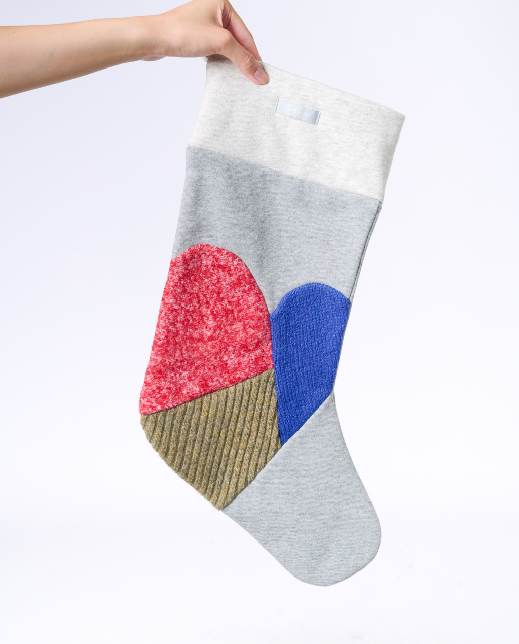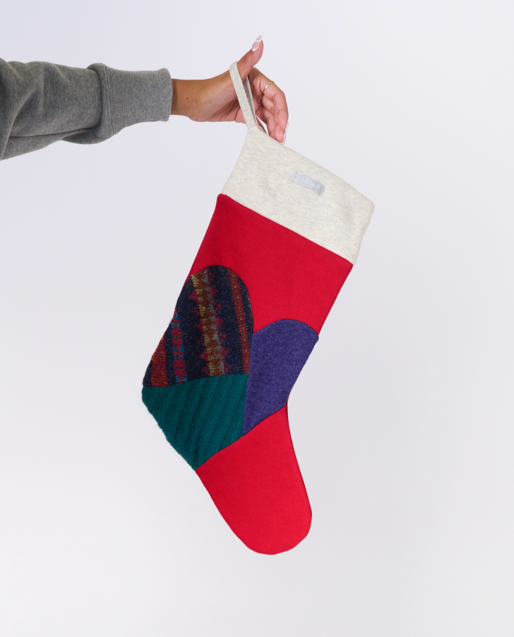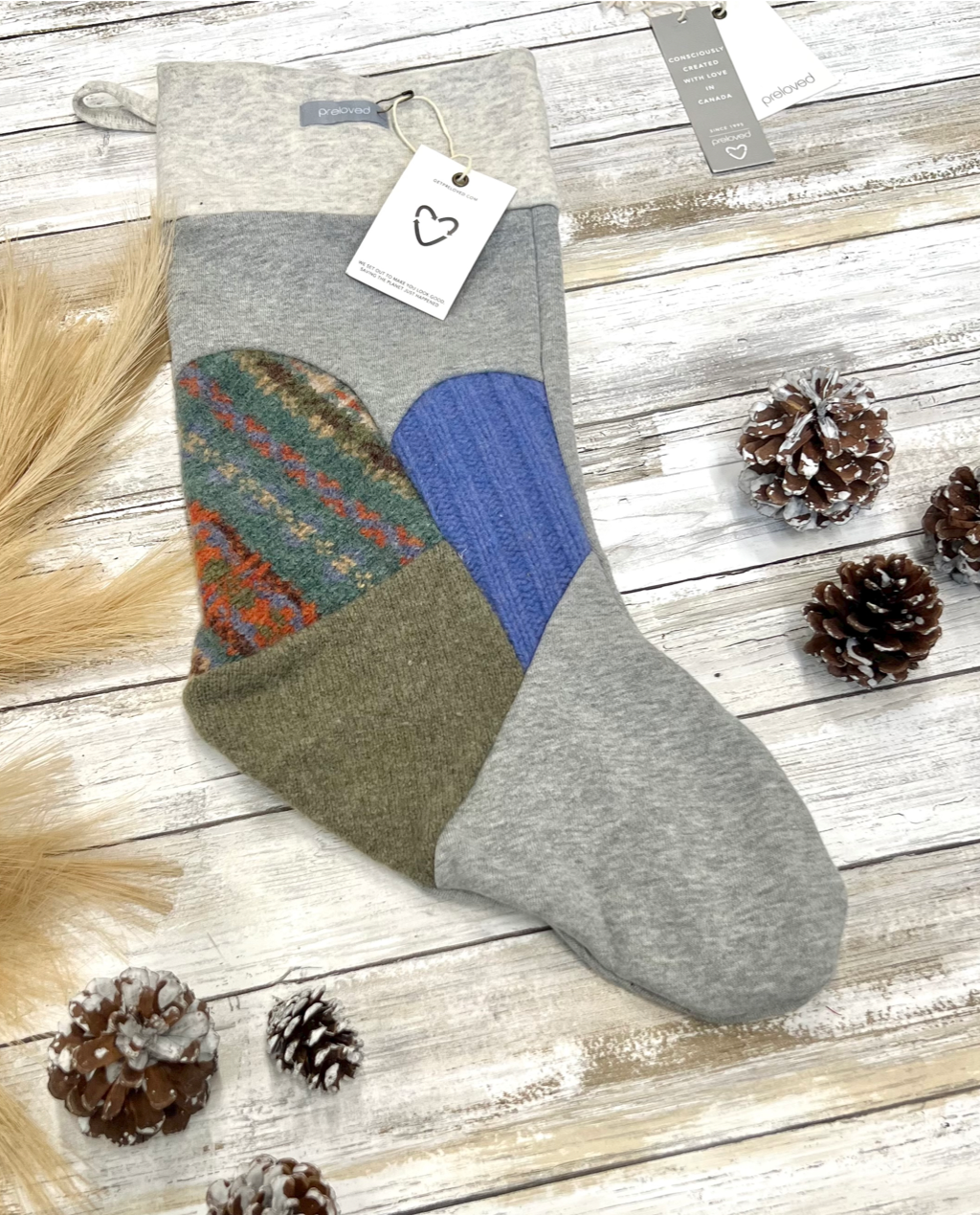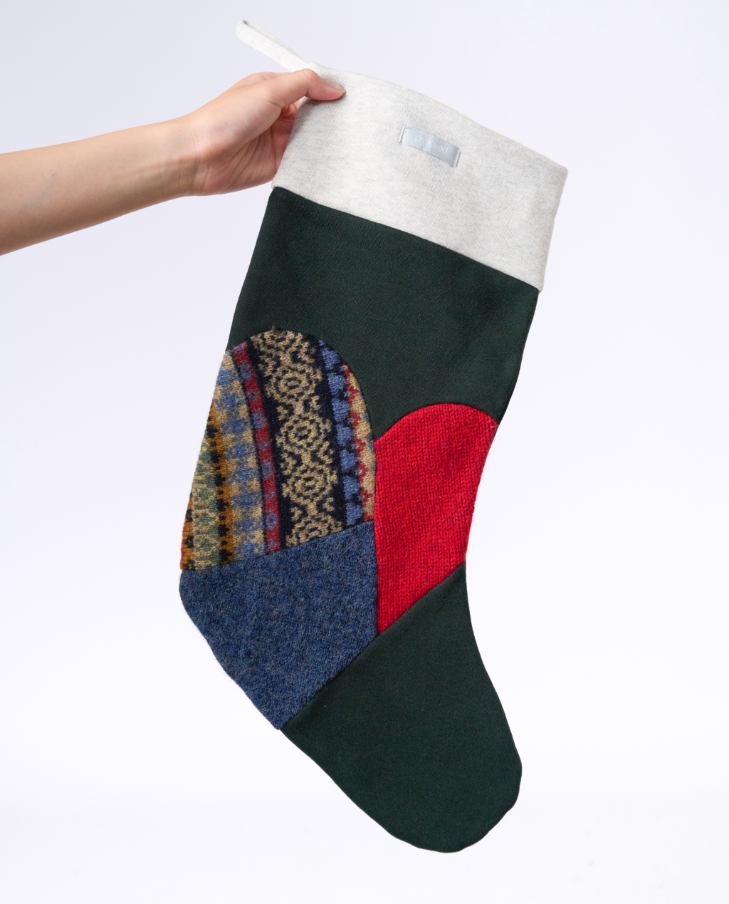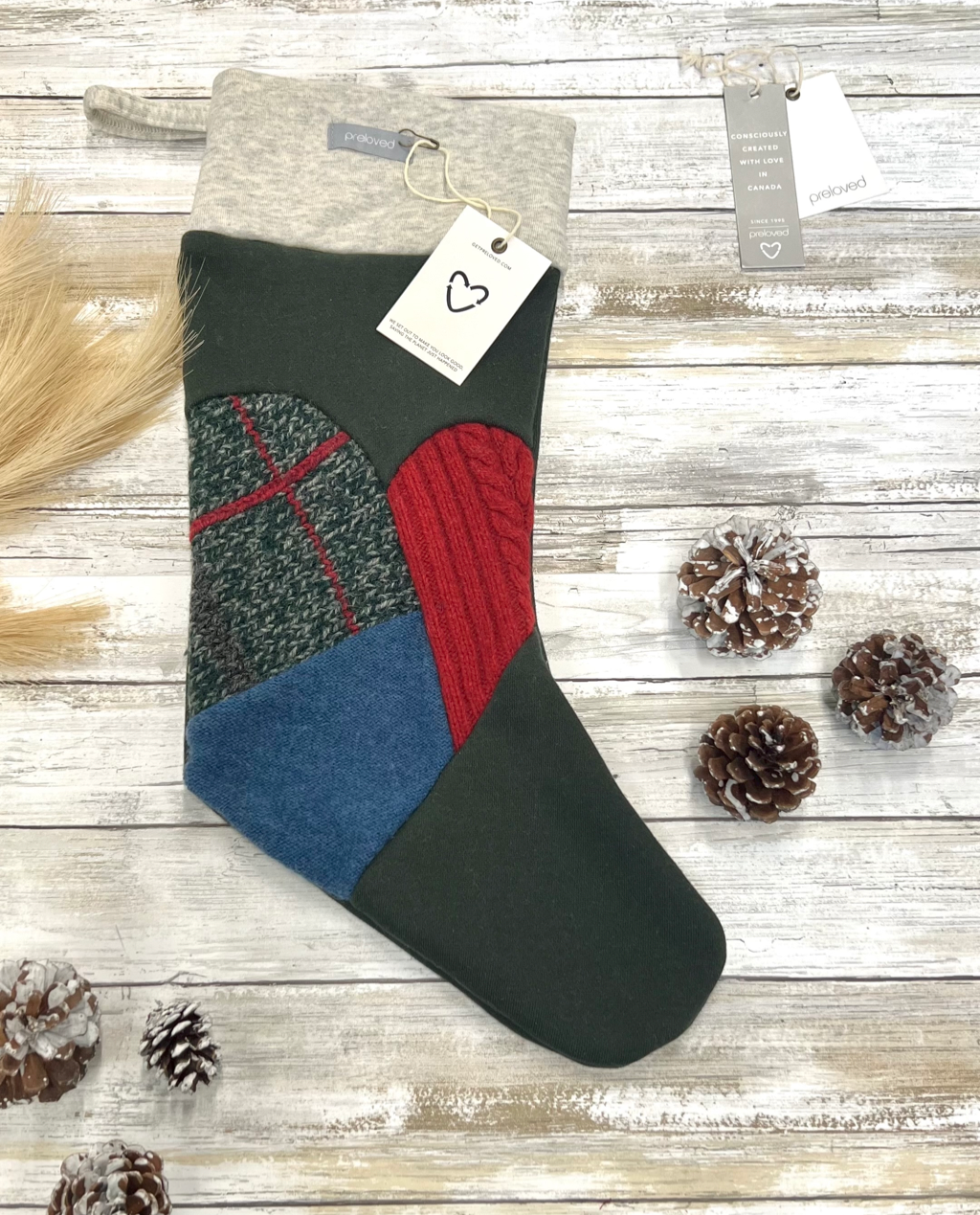 A sustainable addition to your holiday decor! Featuring our signature heart panel design, made with upcycled wool sweaters - each stocking is unique and no two are alike.