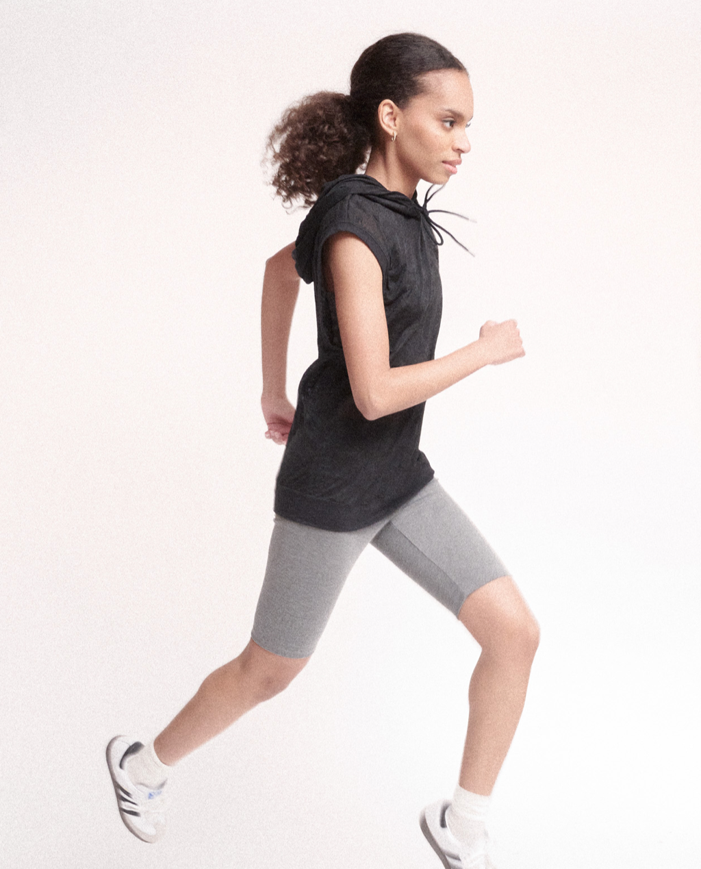 Lightweight hoodie top, constructed from burnout design jersey with upcycled denim heart appliqué. Perfect for layering ontop of a sports bra or our Hala Cropped Top.