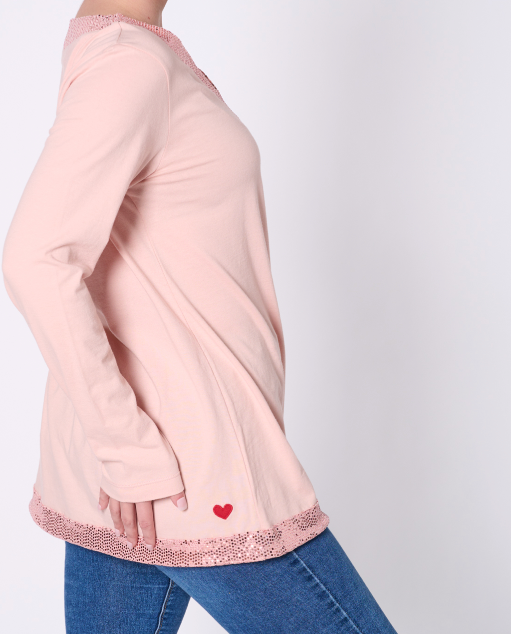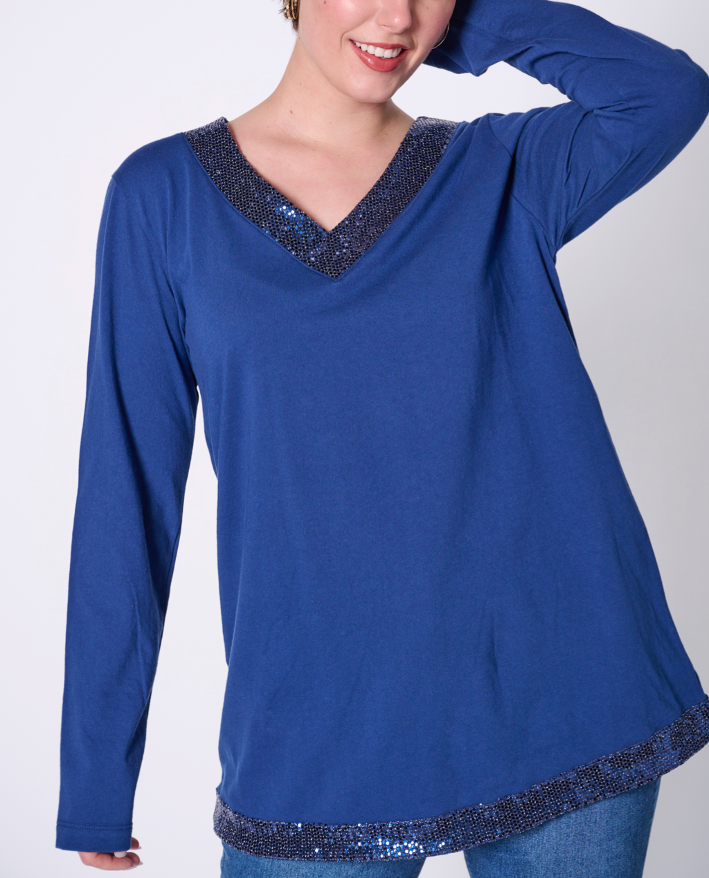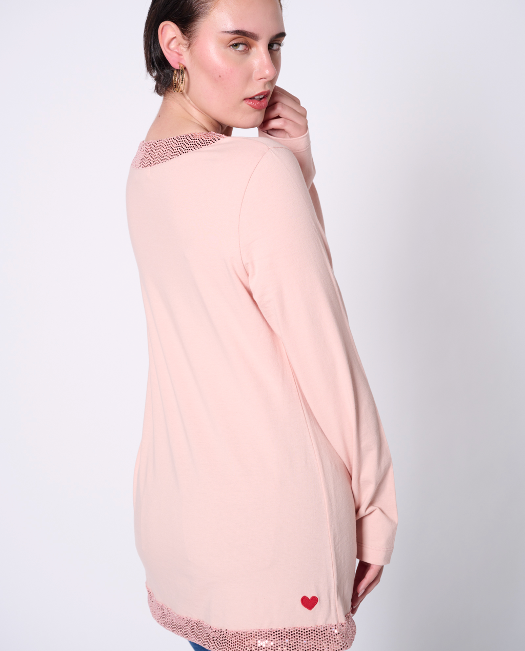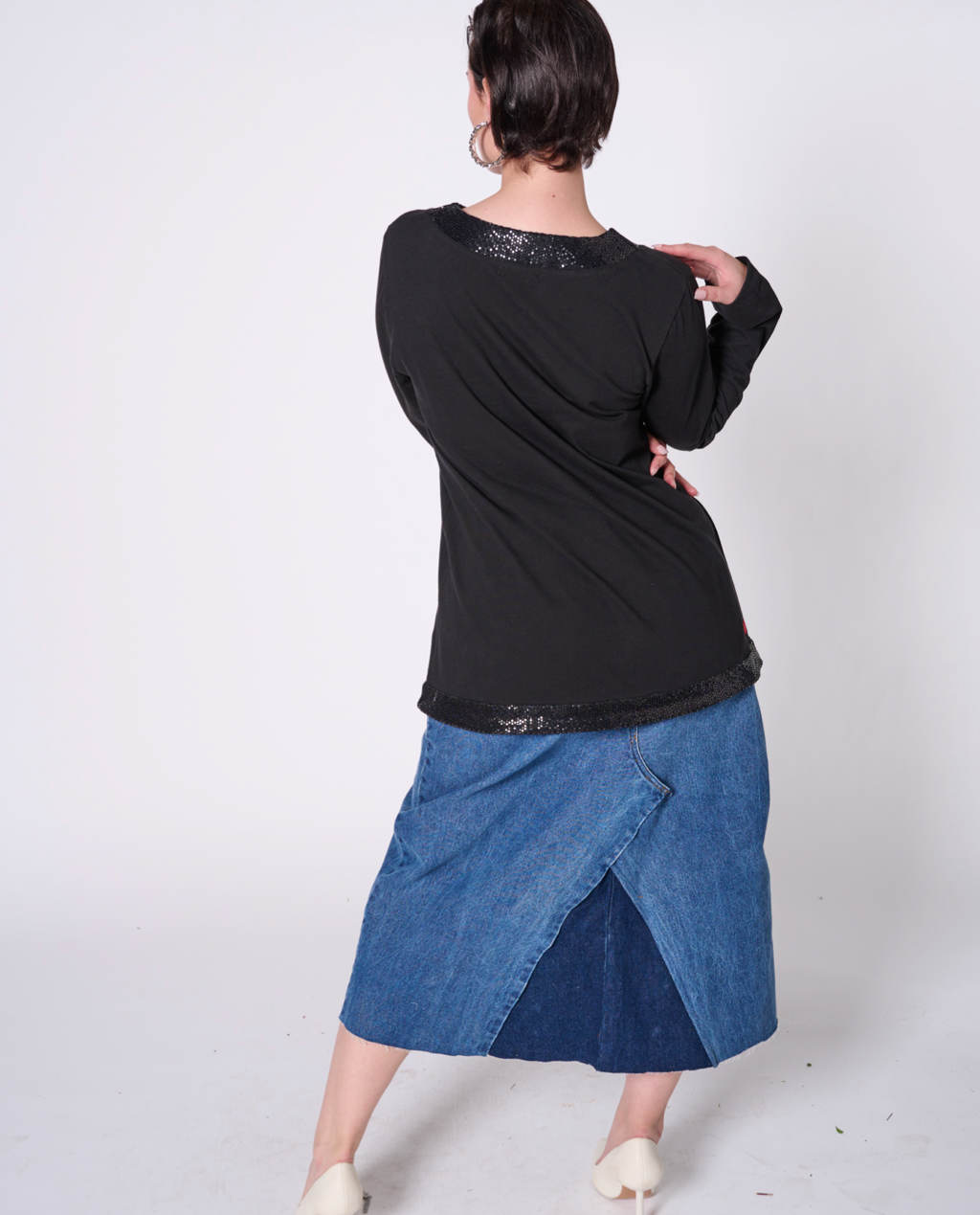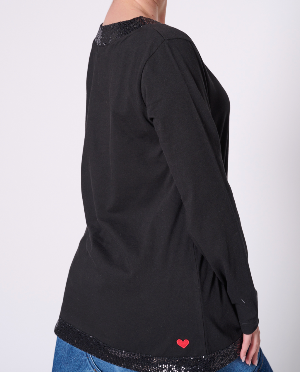 Long sleeve v-neck top with sequin trim on the hem and neckline. Body made with 100% cotton jersey, 50% recycled yarn. Featuring our upcycled red heart patch on the back.