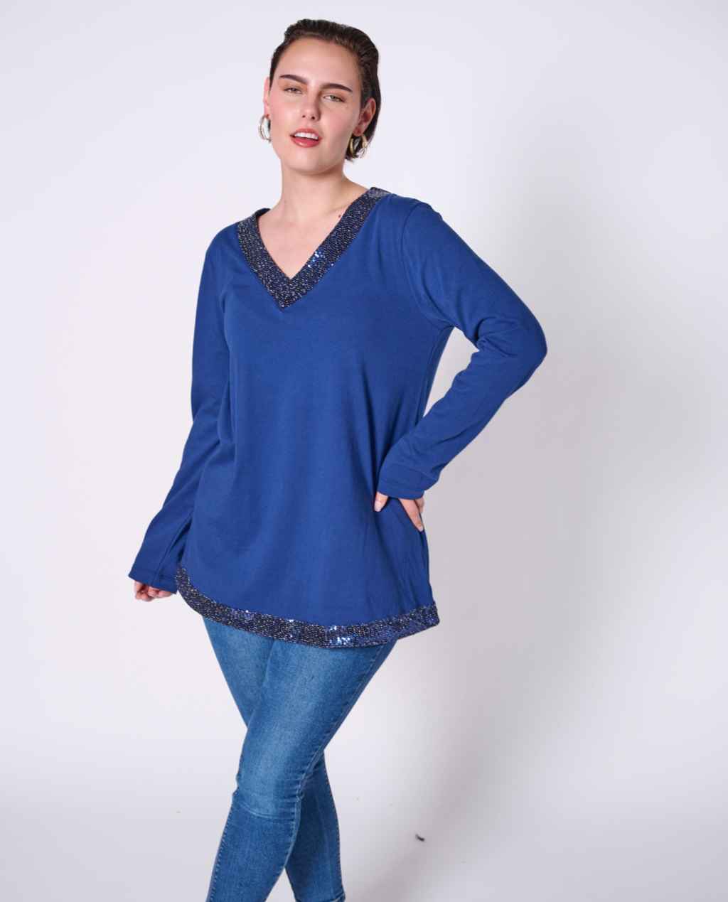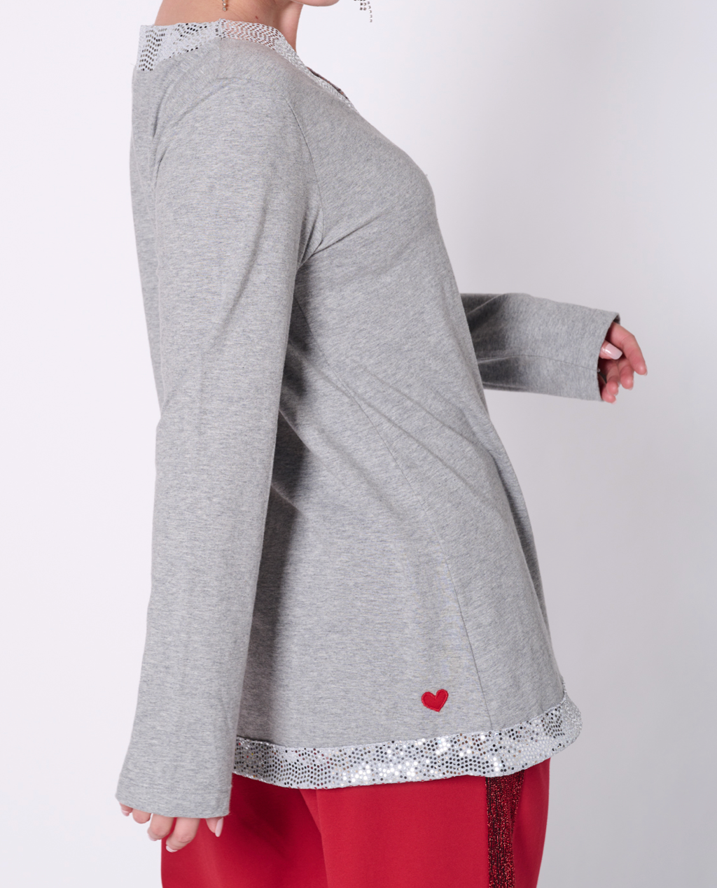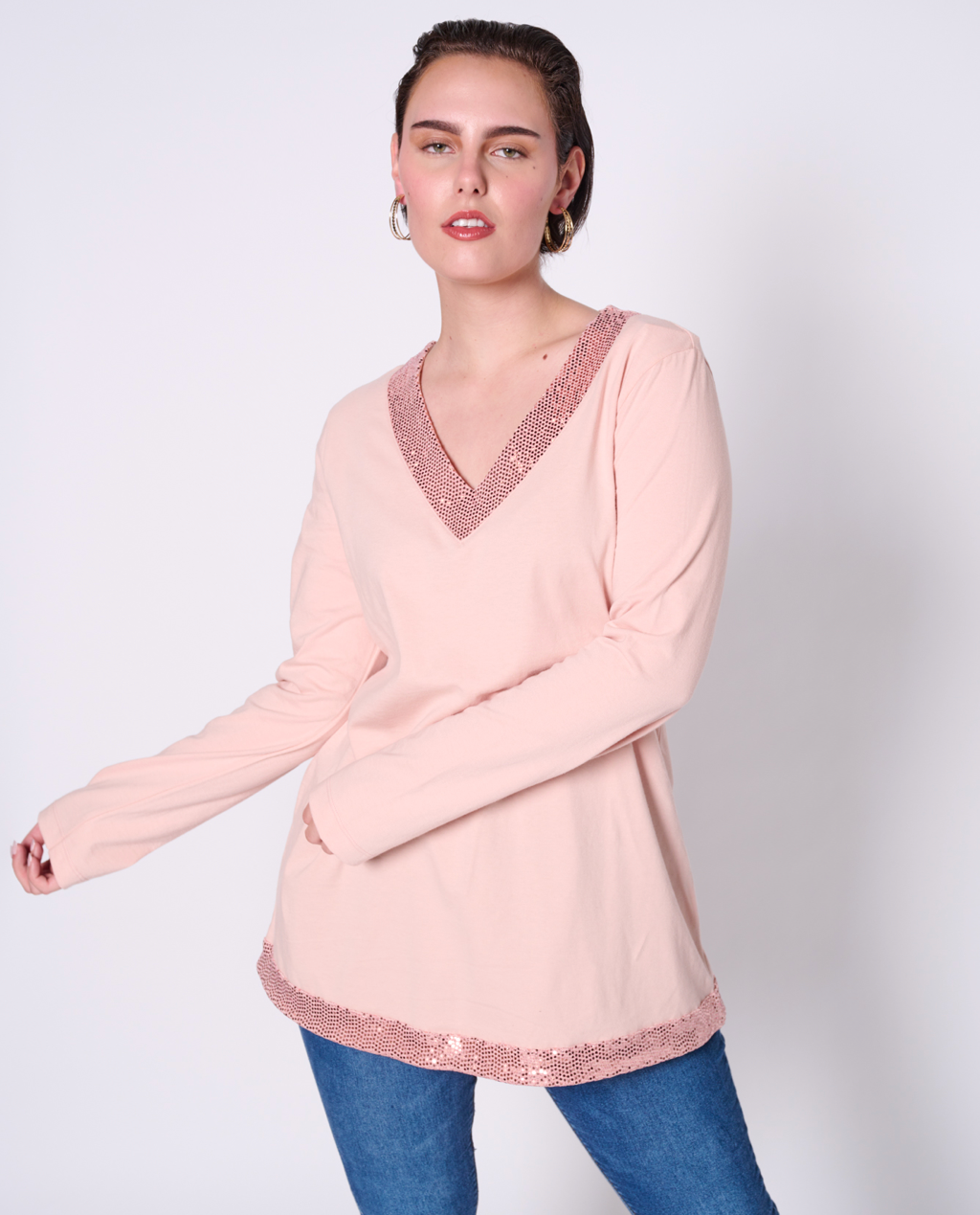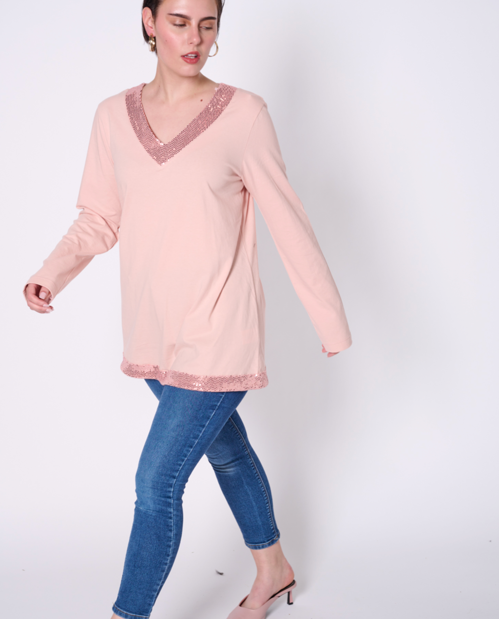 Long sleeve v-neck top with sequin trim on the hem and neckline. Body made with 100% cotton jersey, 50% recycled yarn. Featuring our upcycled red heart patch on the back.