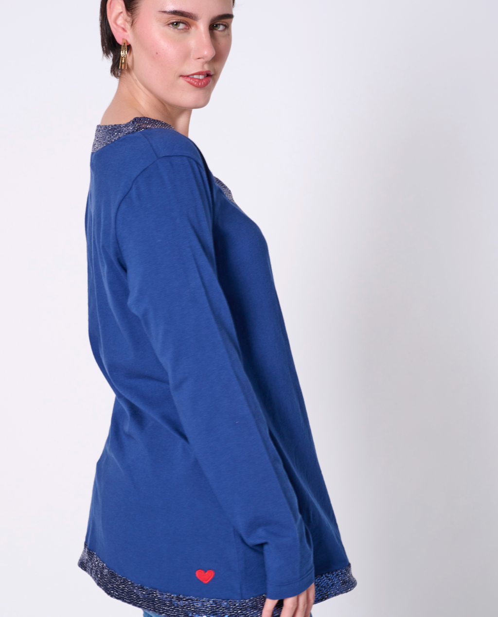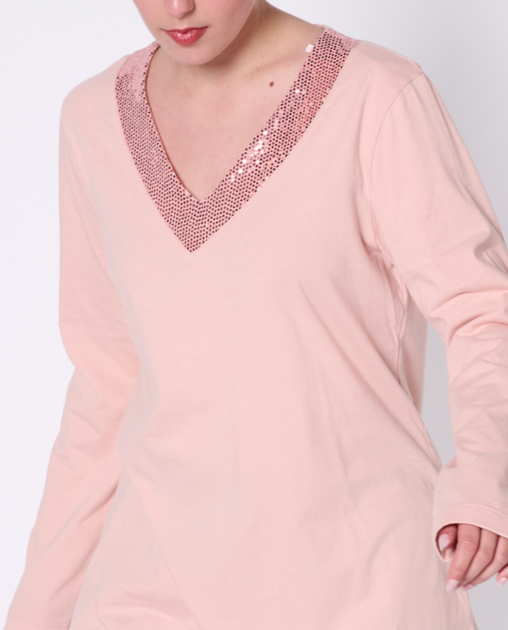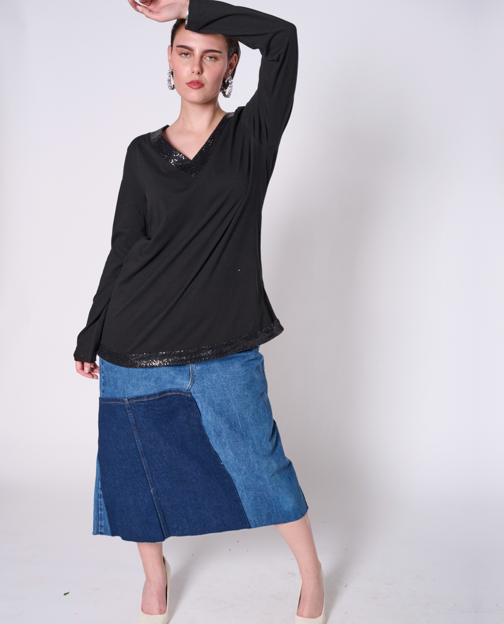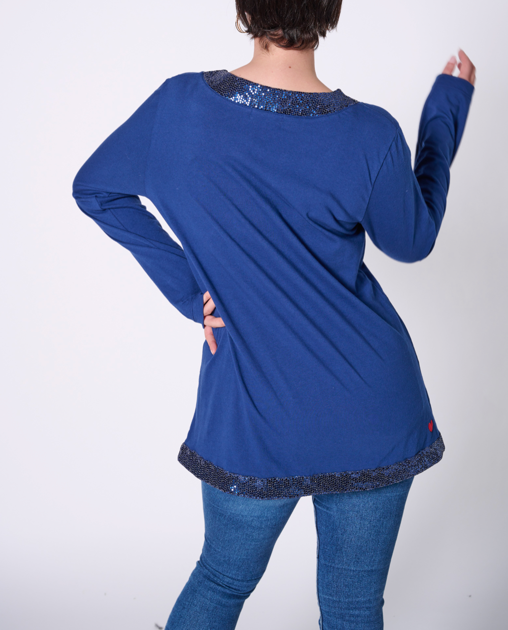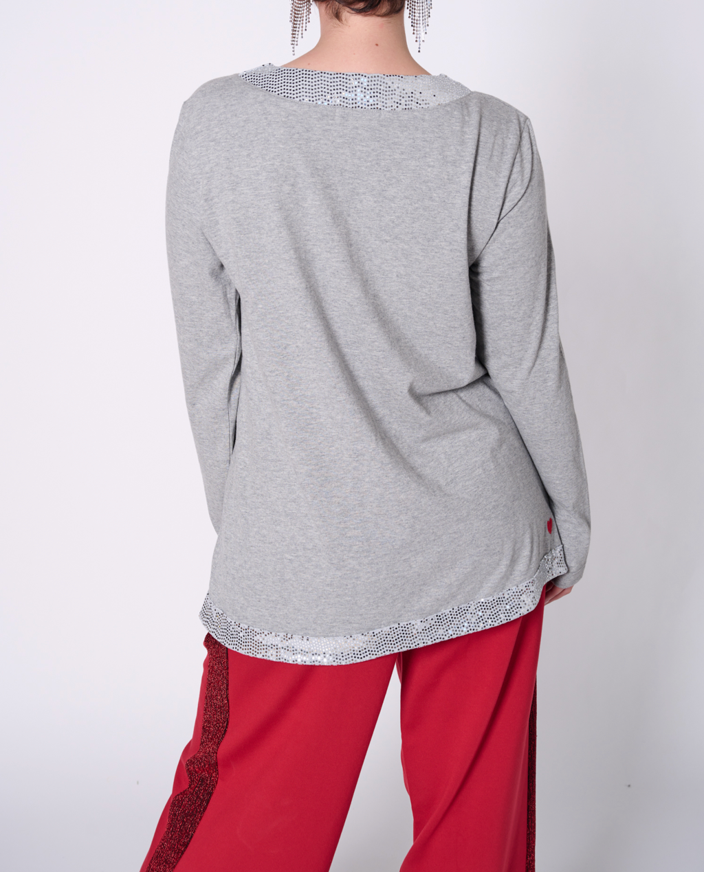 Long sleeve v-neck top with sequin trim on the hem and neckline. Body made with 100% cotton jersey, 50% recycled yarn. Featuring our upcycled red heart patch on the back.