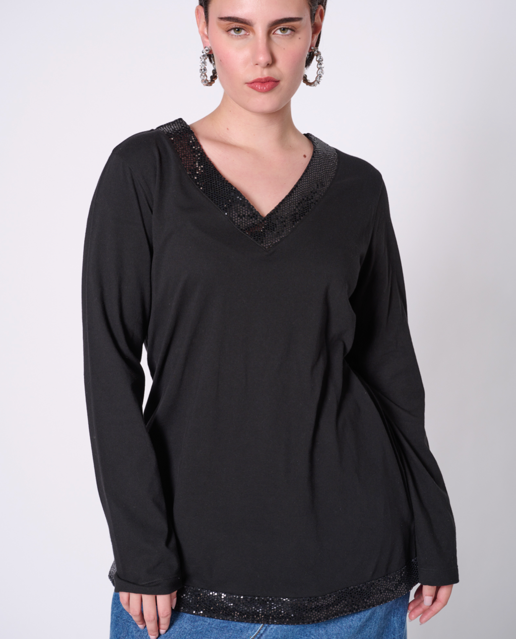 Long sleeve v-neck top with sequin trim on the hem and neckline. Body made with 100% cotton jersey, 50% recycled yarn. Featuring our upcycled red heart patch on the back.