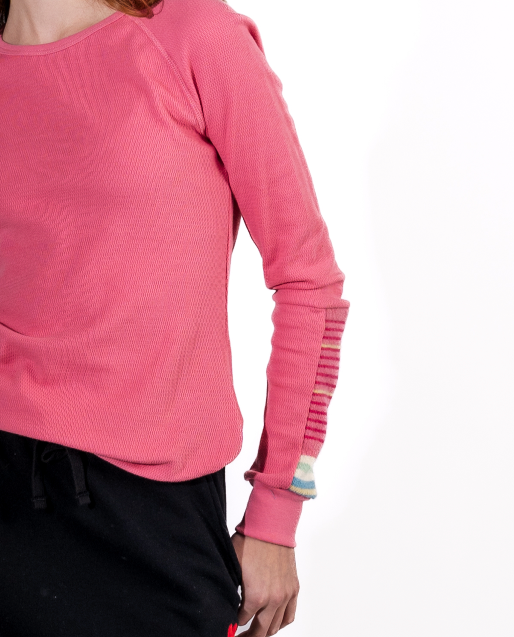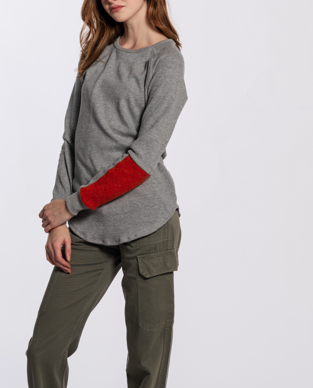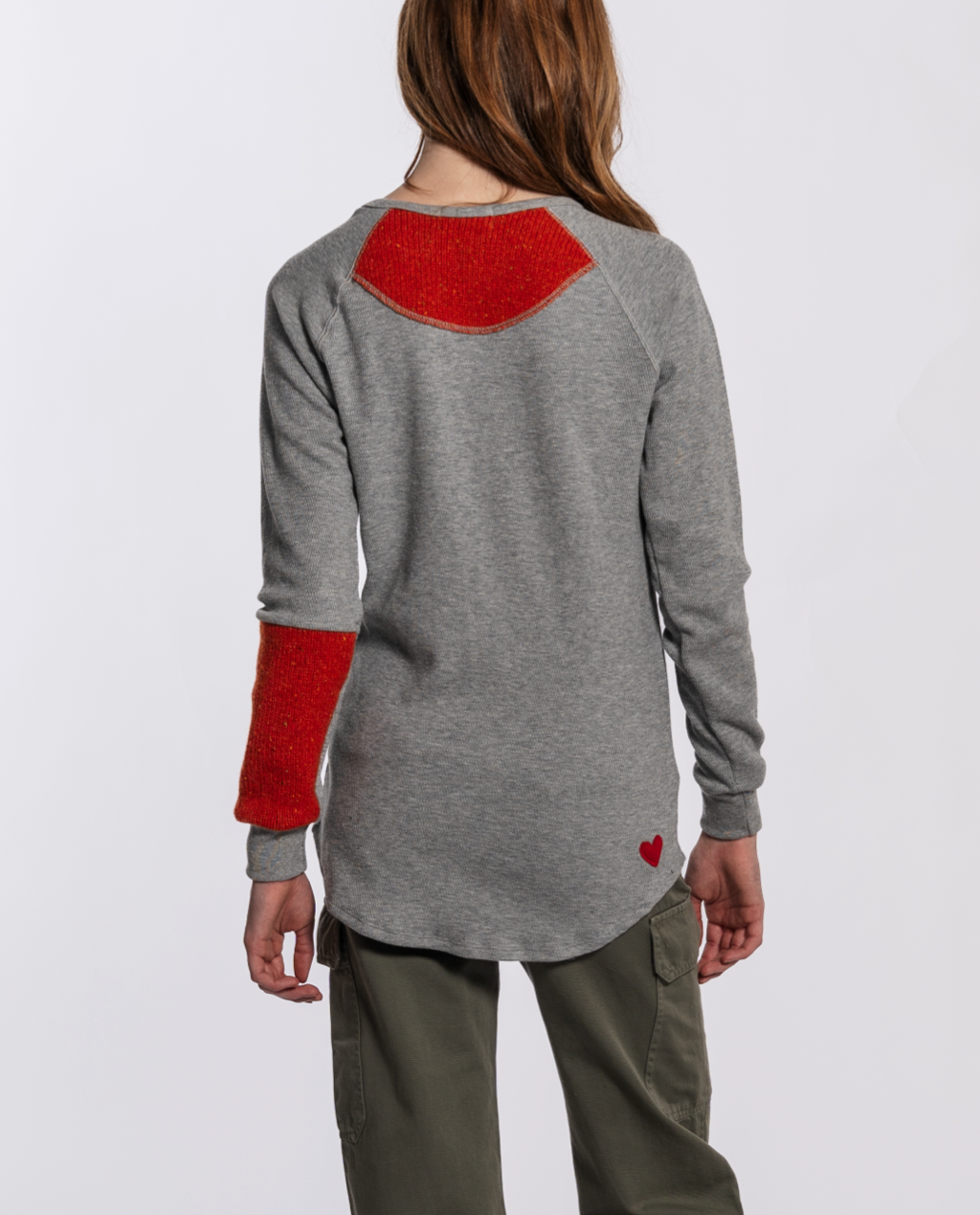 This sustainable and comfortable long sleeve top is made with 100% cotton thermal fabric. Features vintage sweater material accent on one the sleeve, and back yoke, and red heart patch on the back.