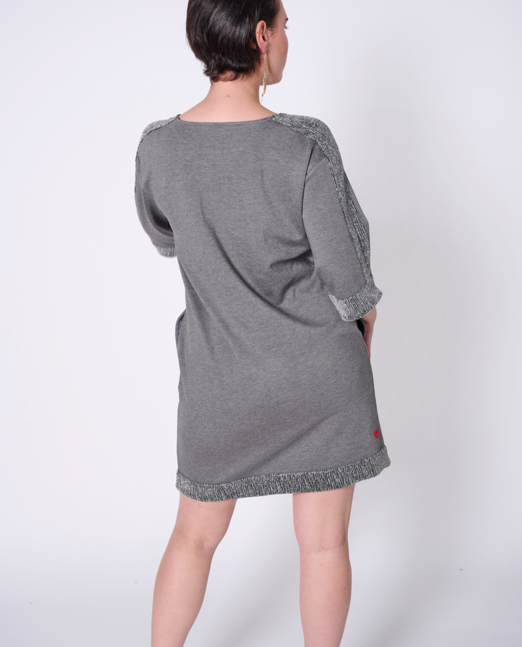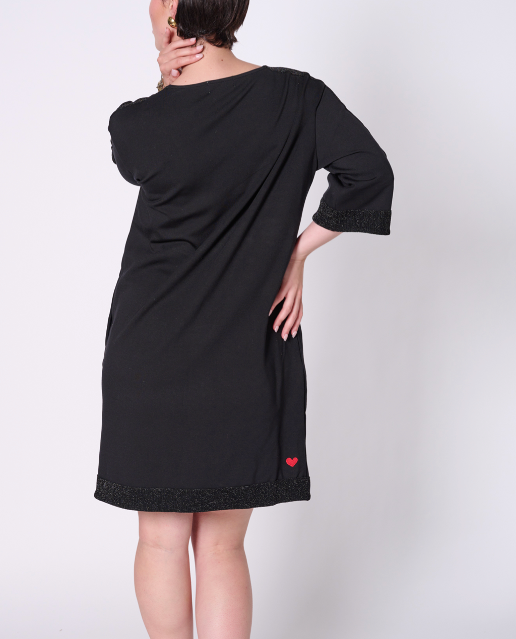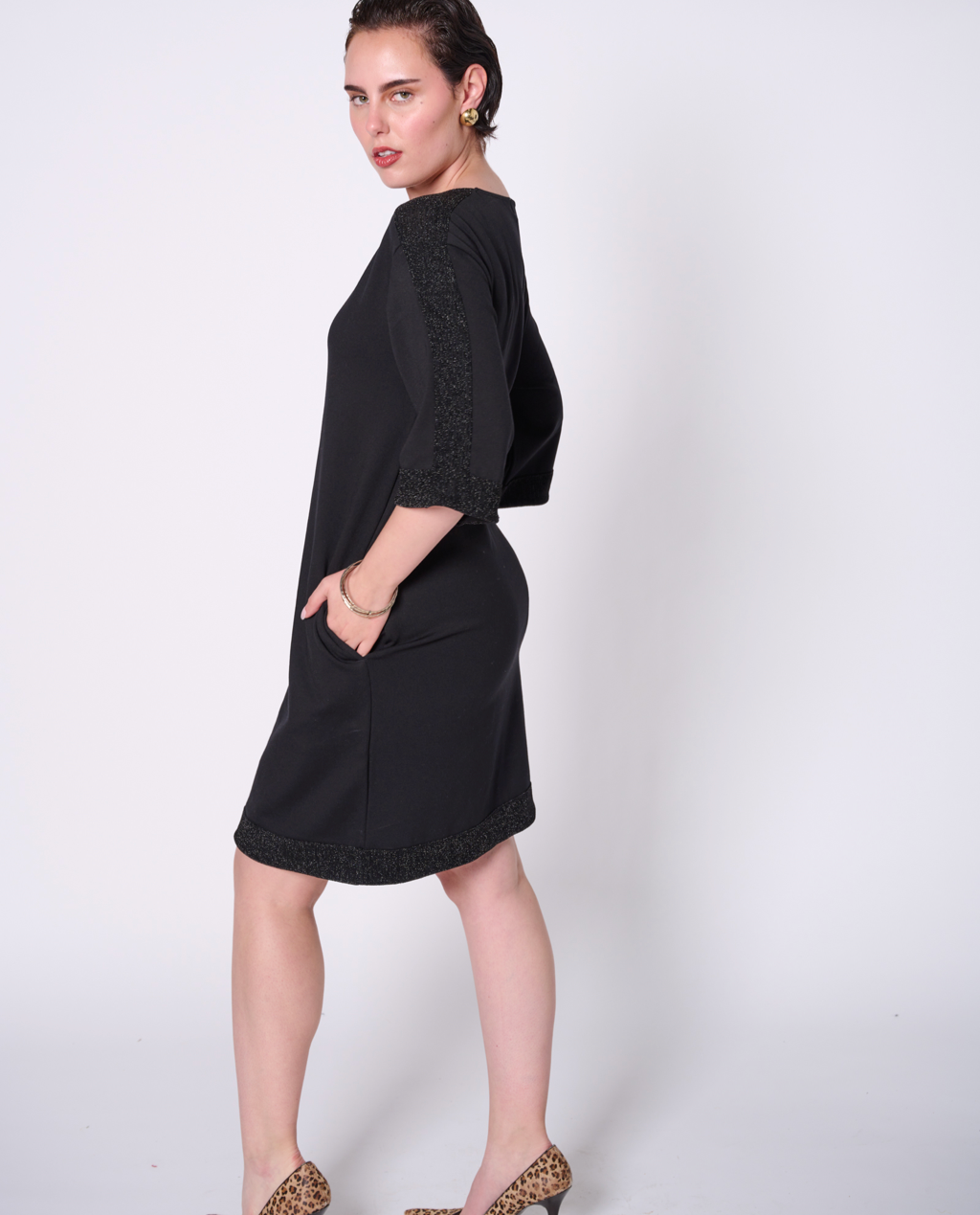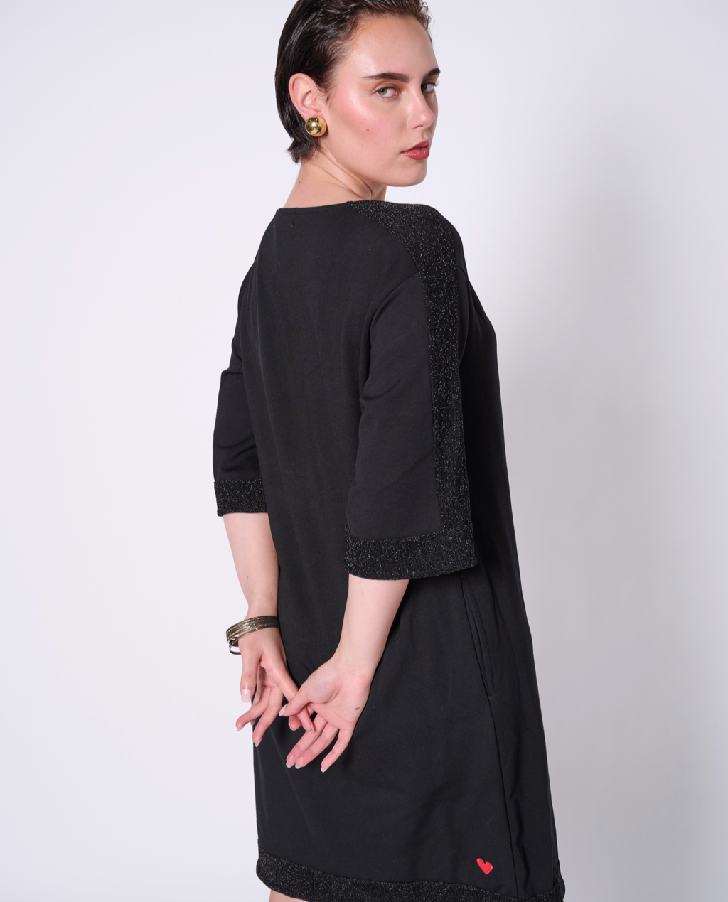 Simple yet elegant dress with 3/4 sleeves and pockets. Metallic fabric trim on the sleeves and hem and body made with ponte. Featuring our upcycled red heart patch on the back.