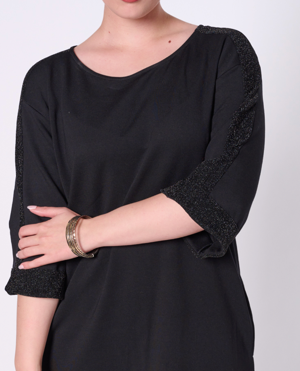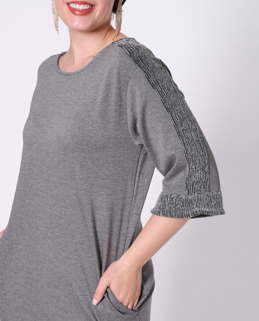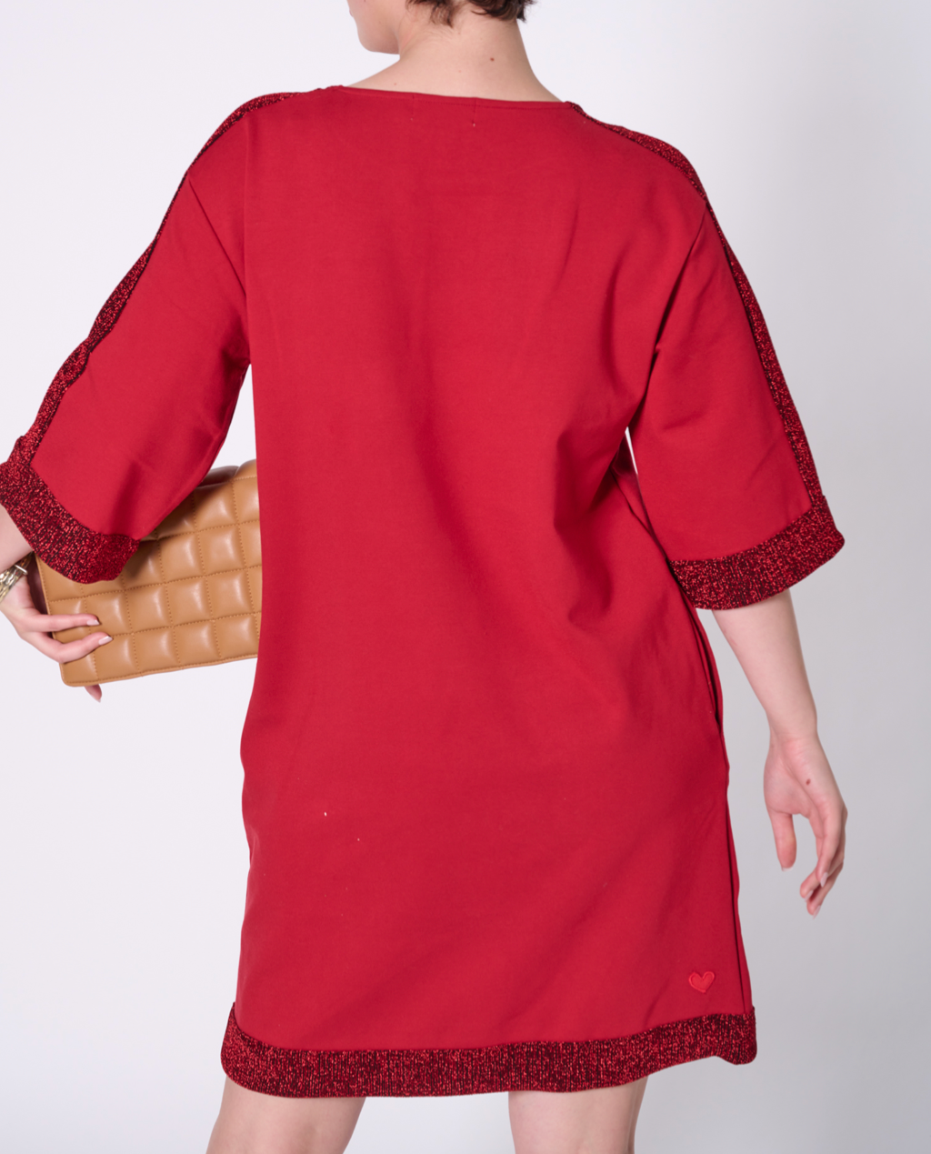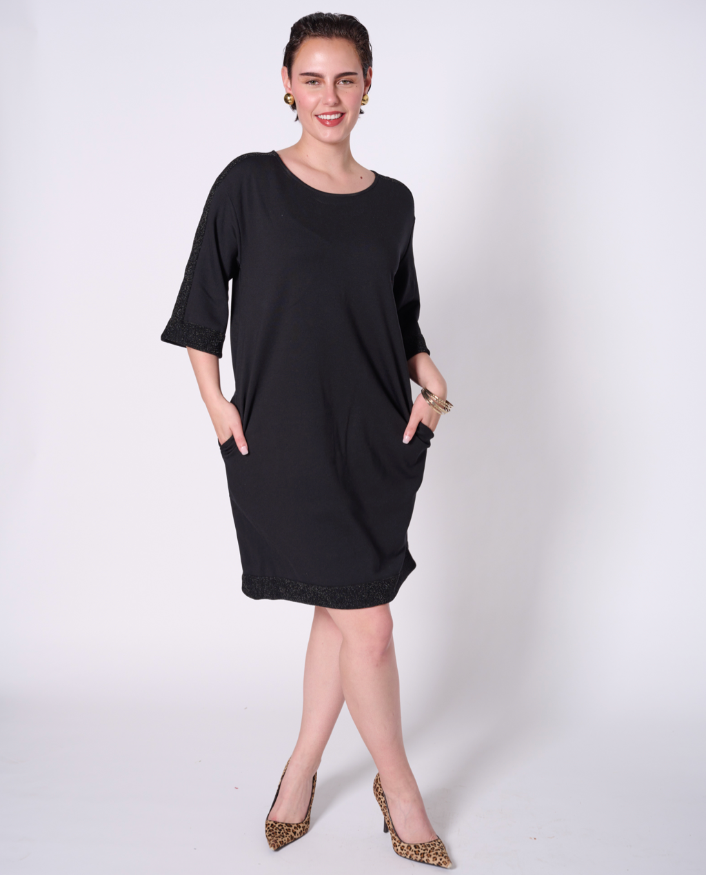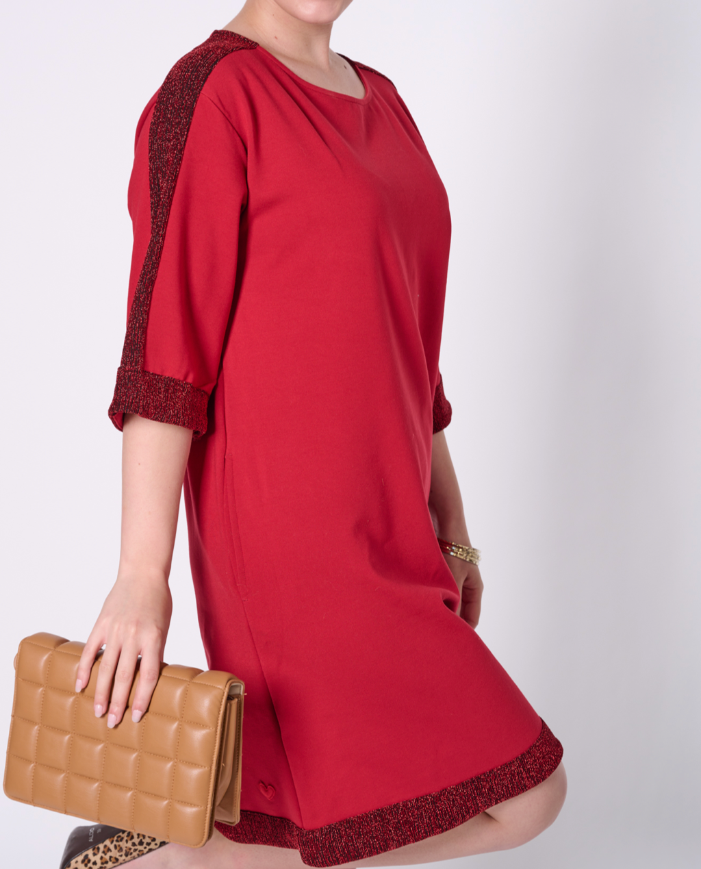 Simple yet elegant dress with 3/4 sleeves and pockets. Metallic fabric trim on the sleeves and hem and body made with ponte. Featuring our upcycled red heart patch on the back.