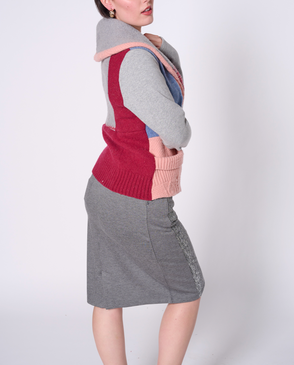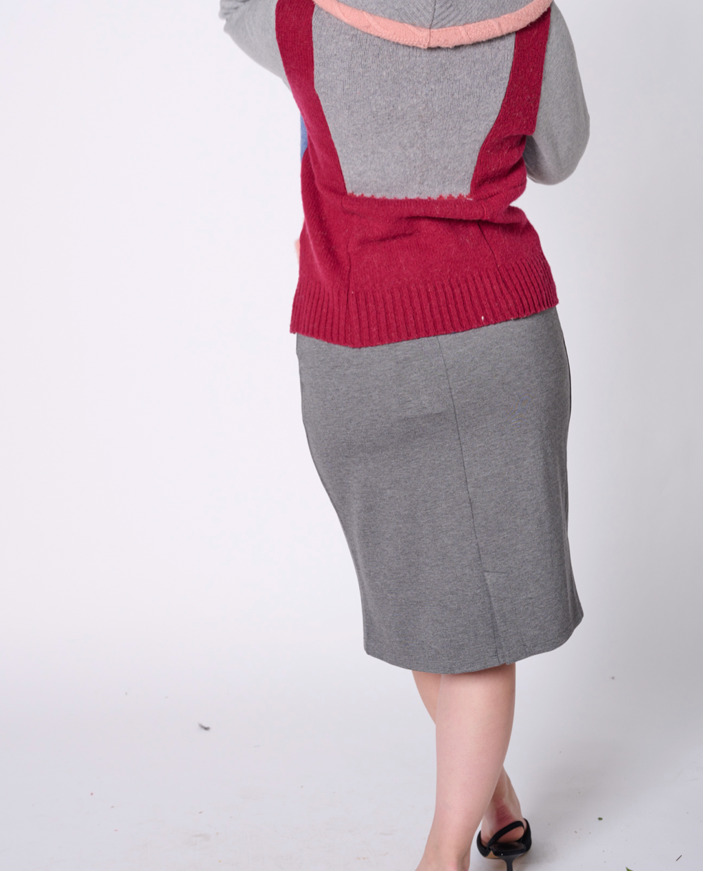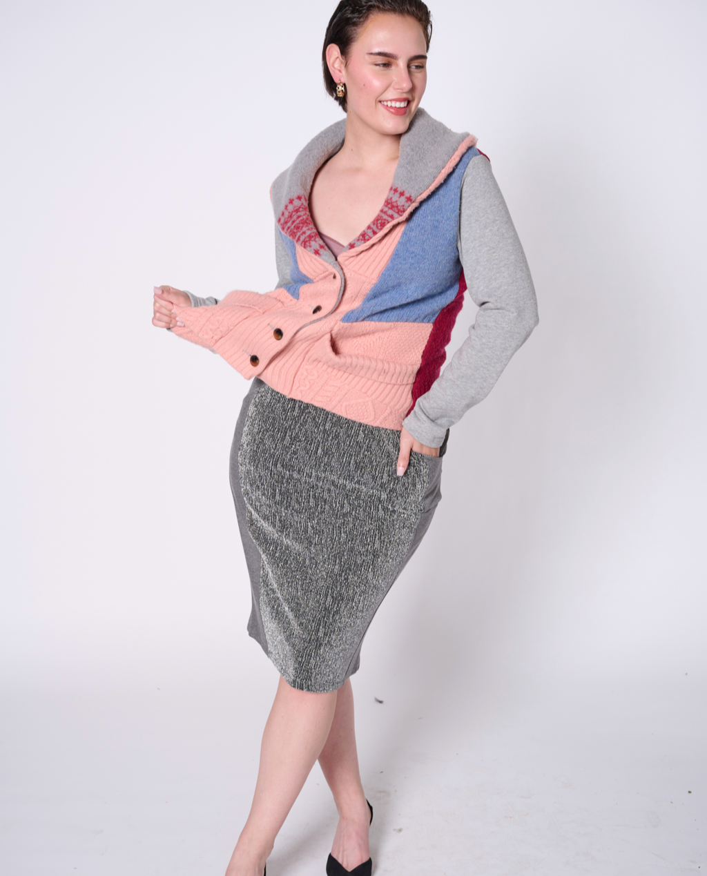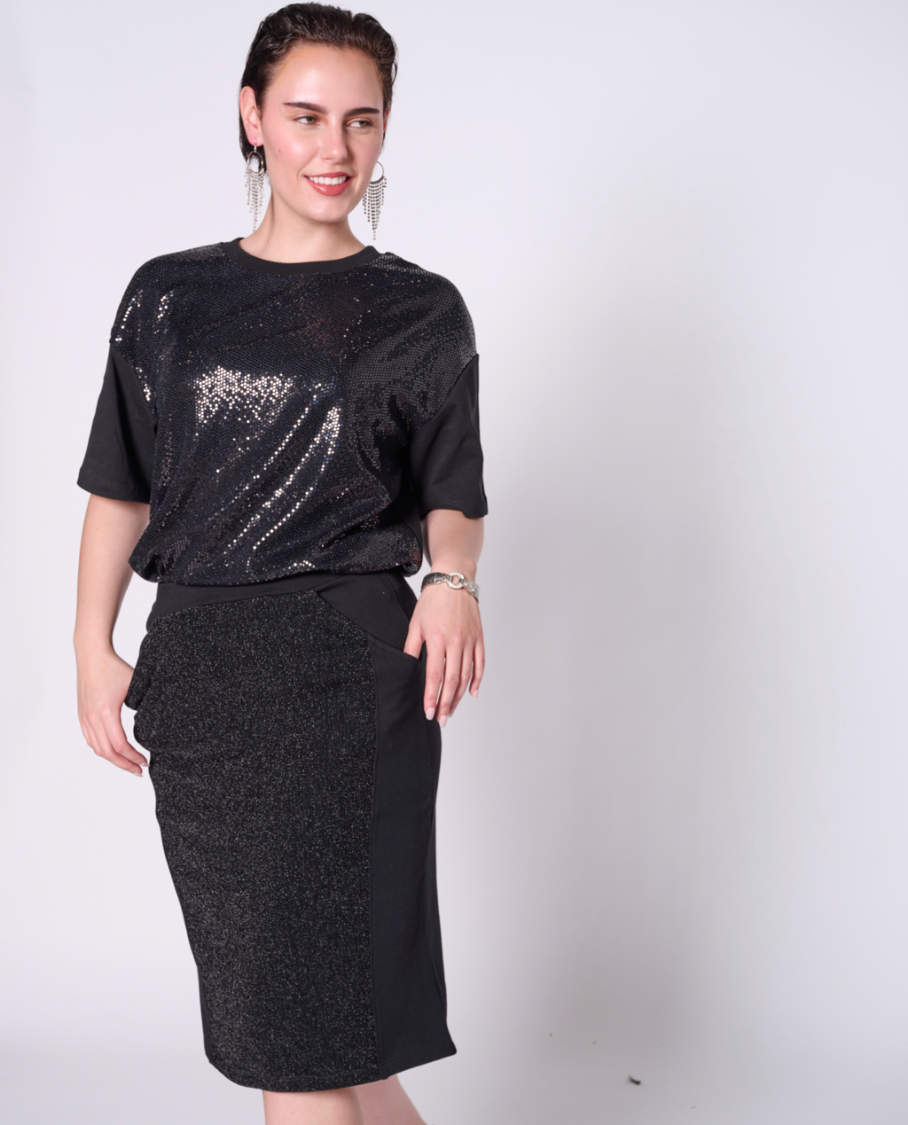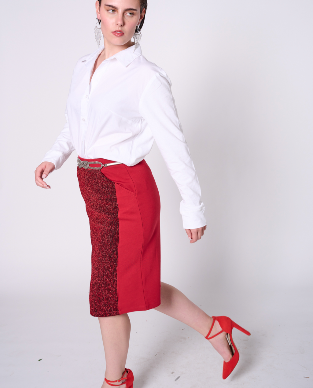 Stretchy pencil style skirt with slit in the back and pockets. Design panels with metallic fabric on the front create a slimming effect, body made with ponte. Featuring our upcycled red heart patch on the back.