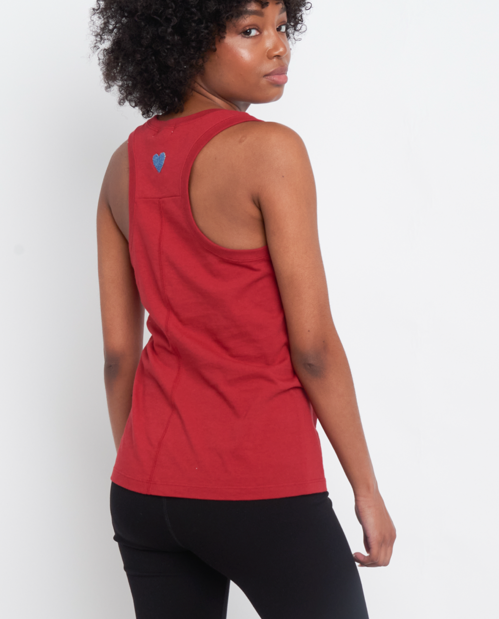 Racerback top, constructed from 100% cotton jersey - inside yoke made with upcycled striped tee and features upcycled denim heart appliqué.