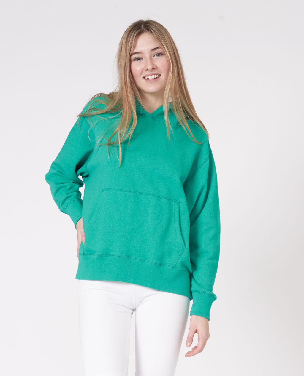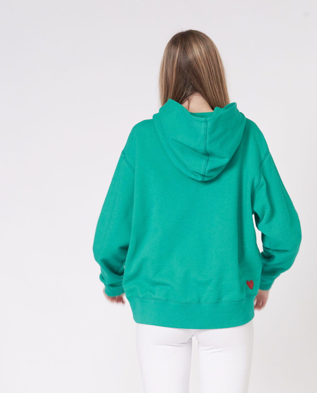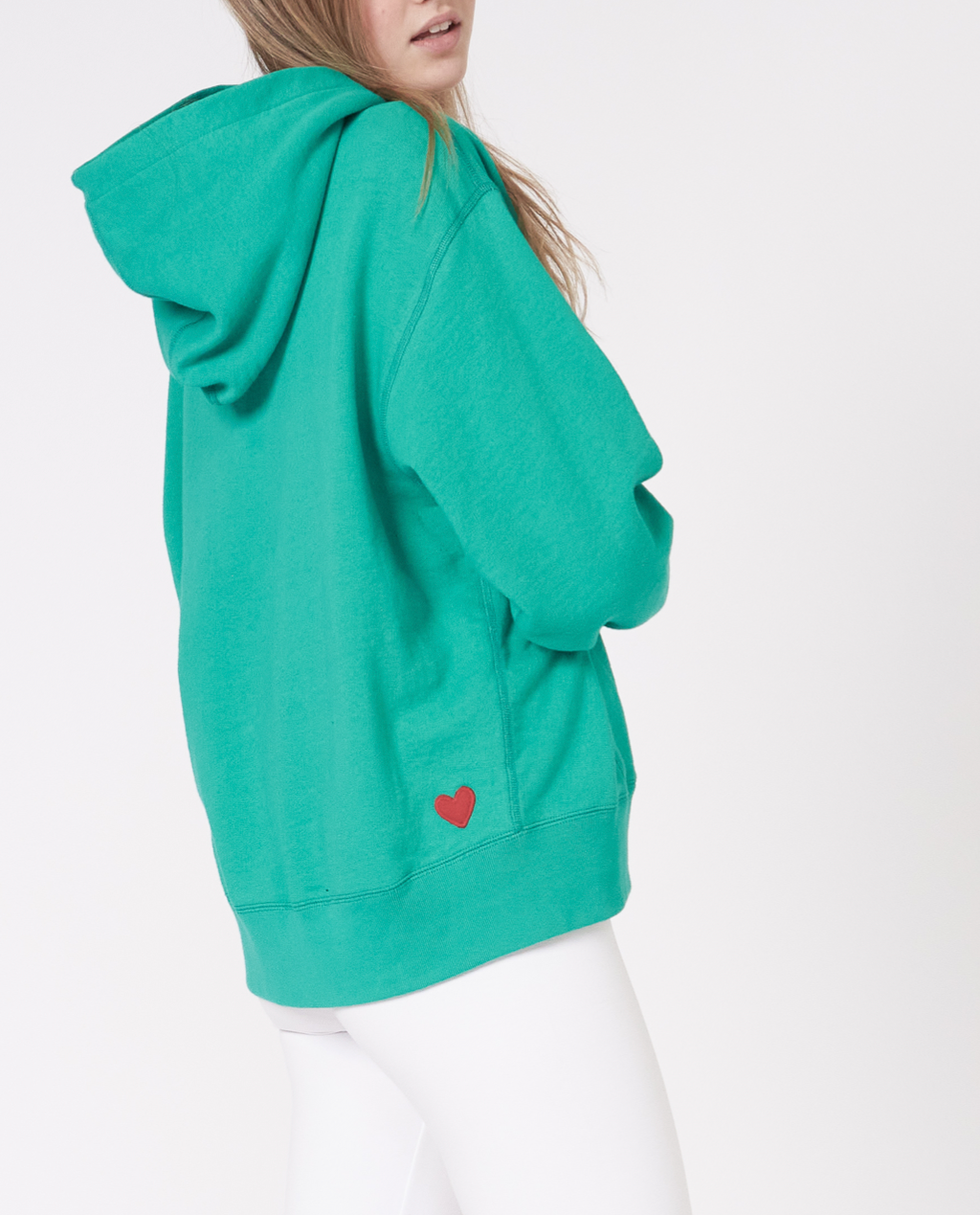 Structured hoodie with front pockets, featuring our signature heart patch on the back. 100% cotton terry with 50% recycled materials.
