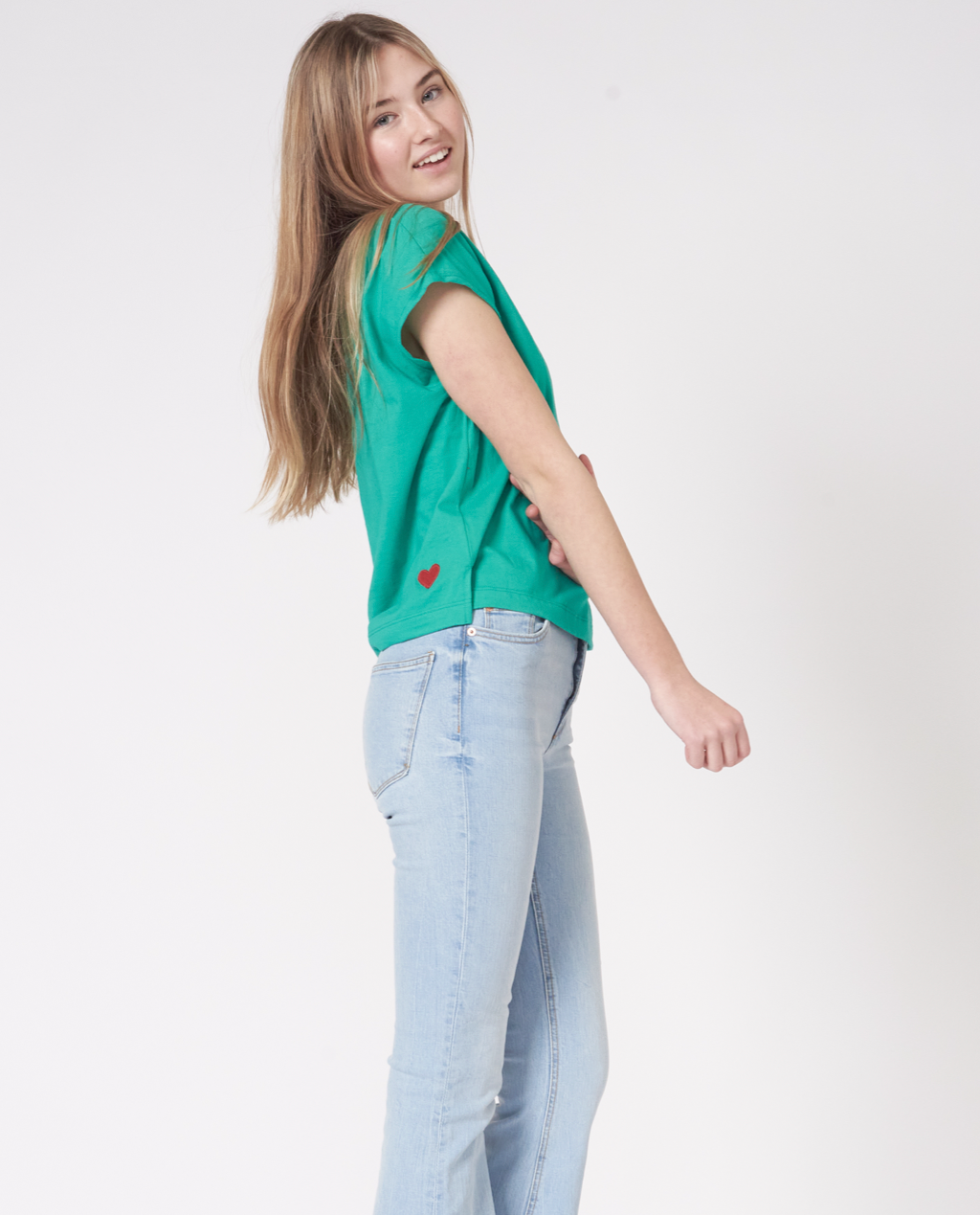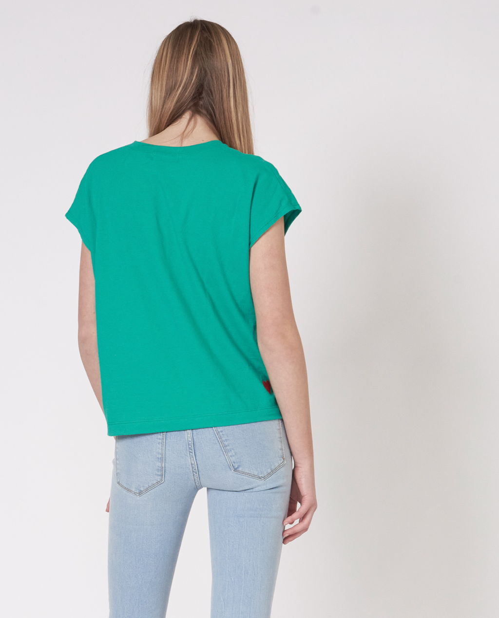 Versatile and fun V-neck top with a boxy fit over the shoulders, made with 100% cotton jersey (50% recycled yarn and 50% in normal yarn). It features mall side slits and upcycled red heart patch on the back.