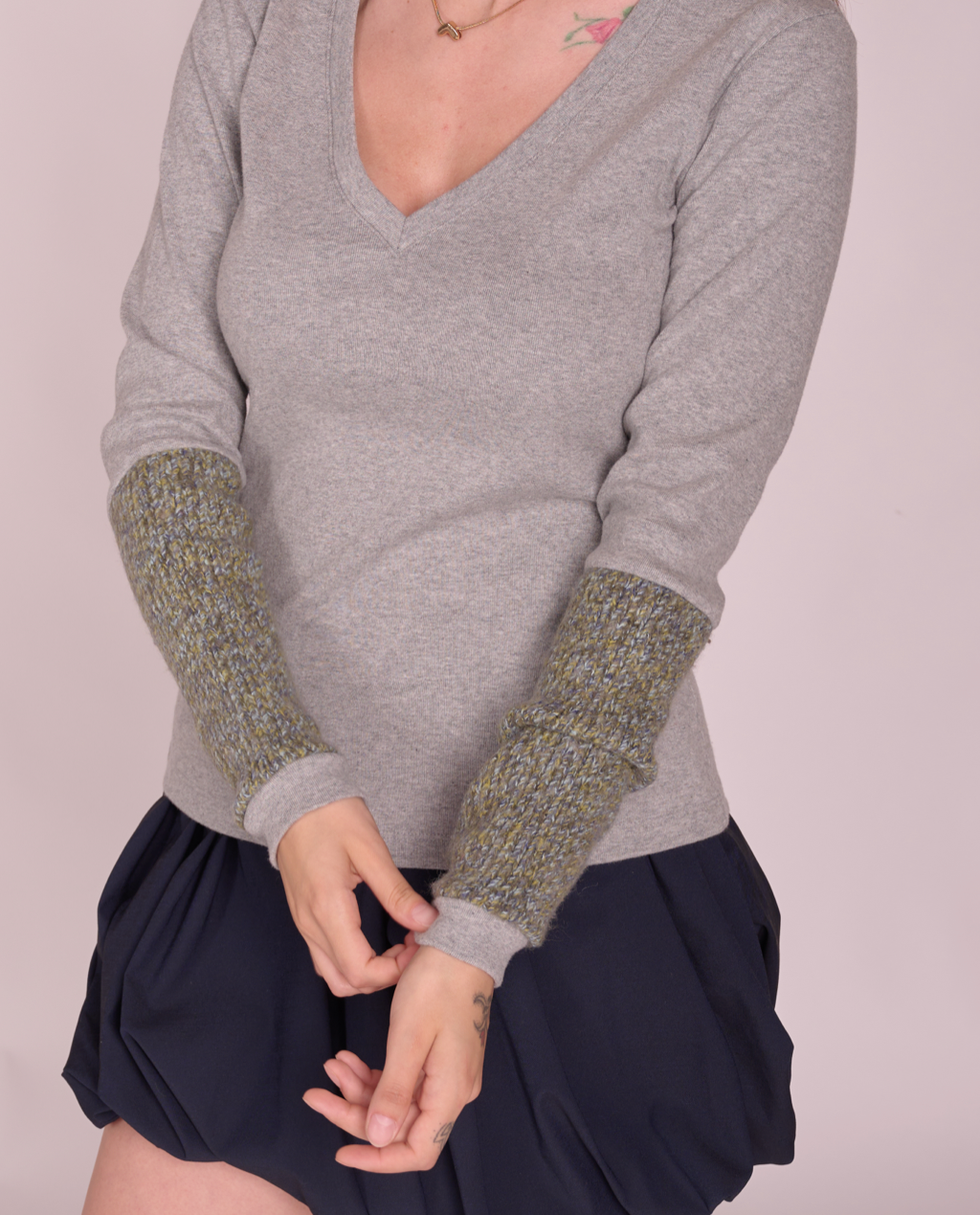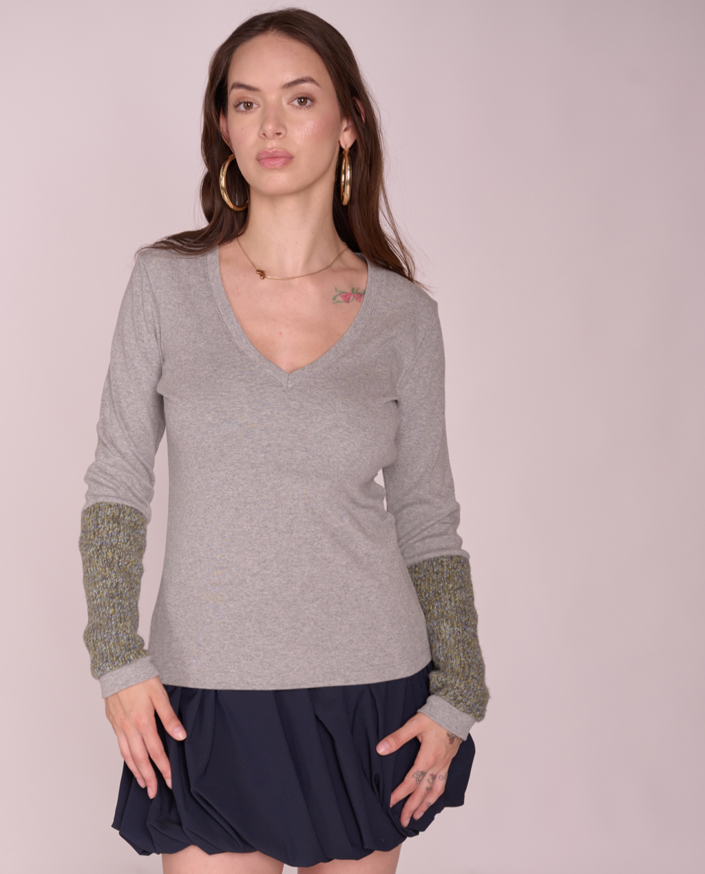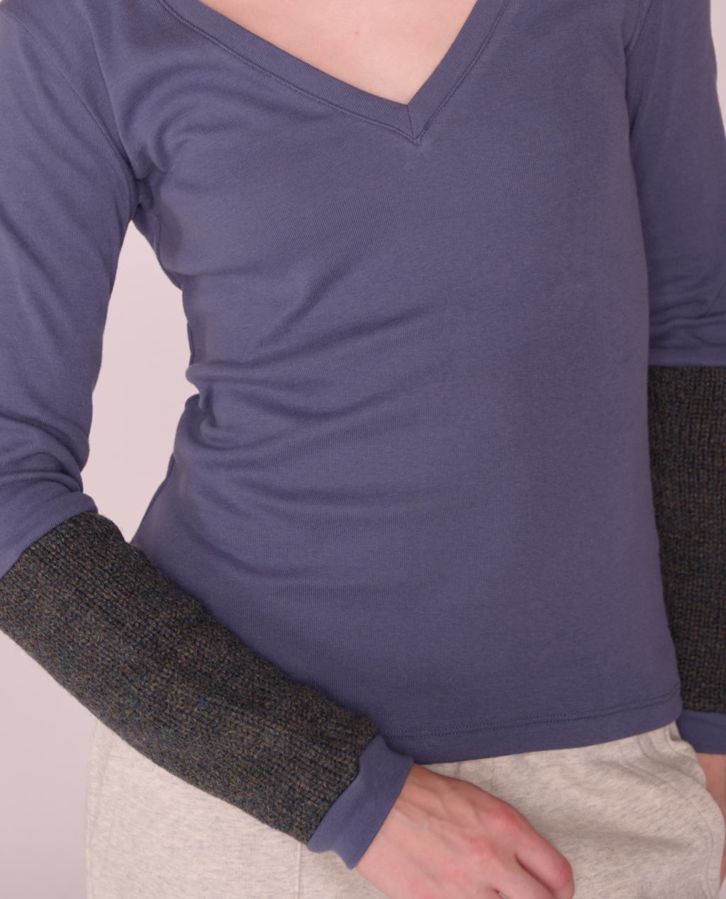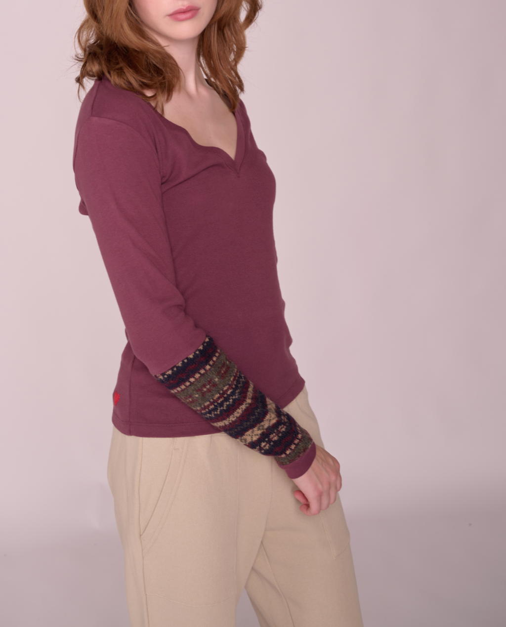 A pop of upcycled wool sweaters, turns this basic 100% cotton long sleeve v-neck top into a one-of-a-kind gem. Paired perfectly with a pair of jeans or a maxi skirt.