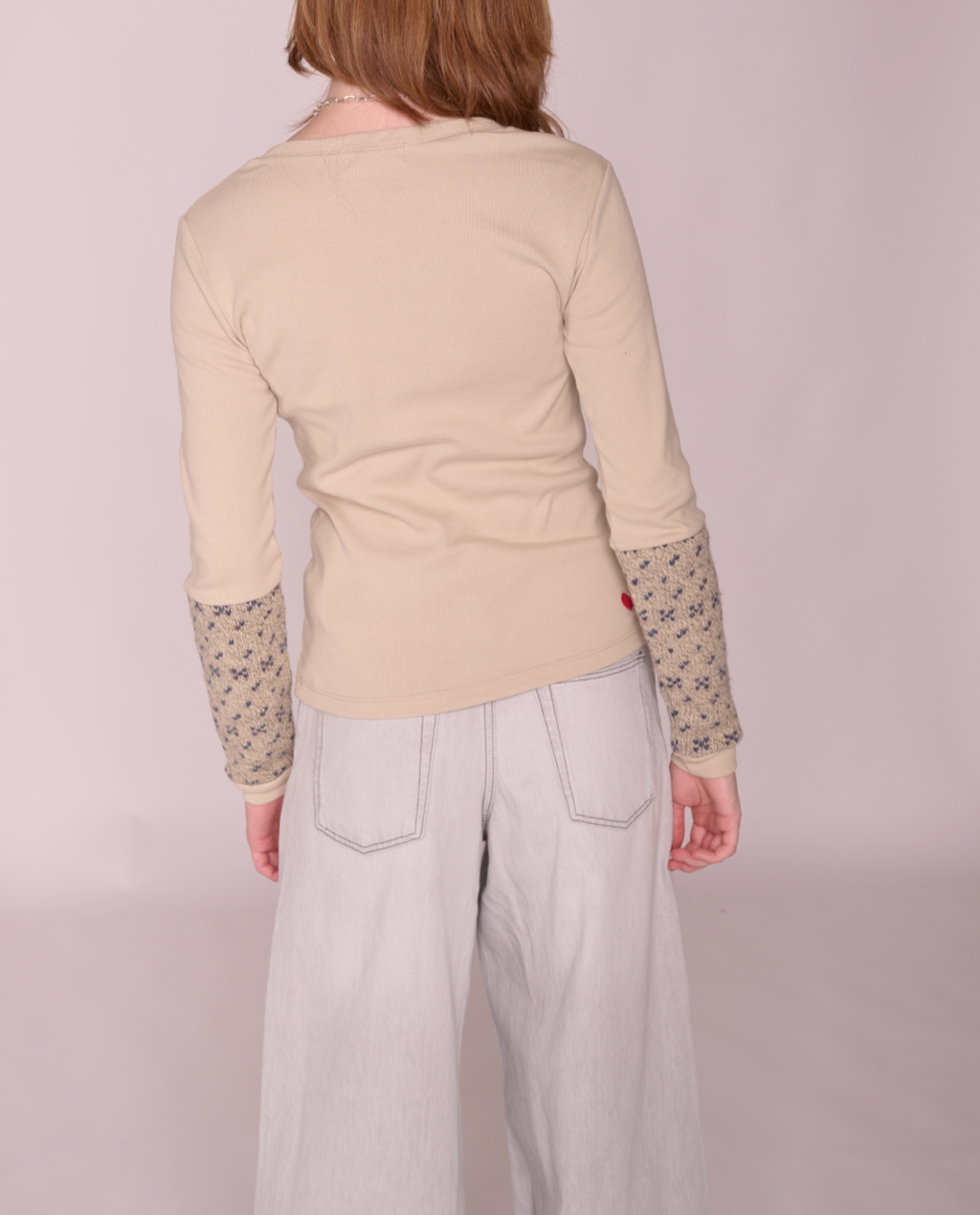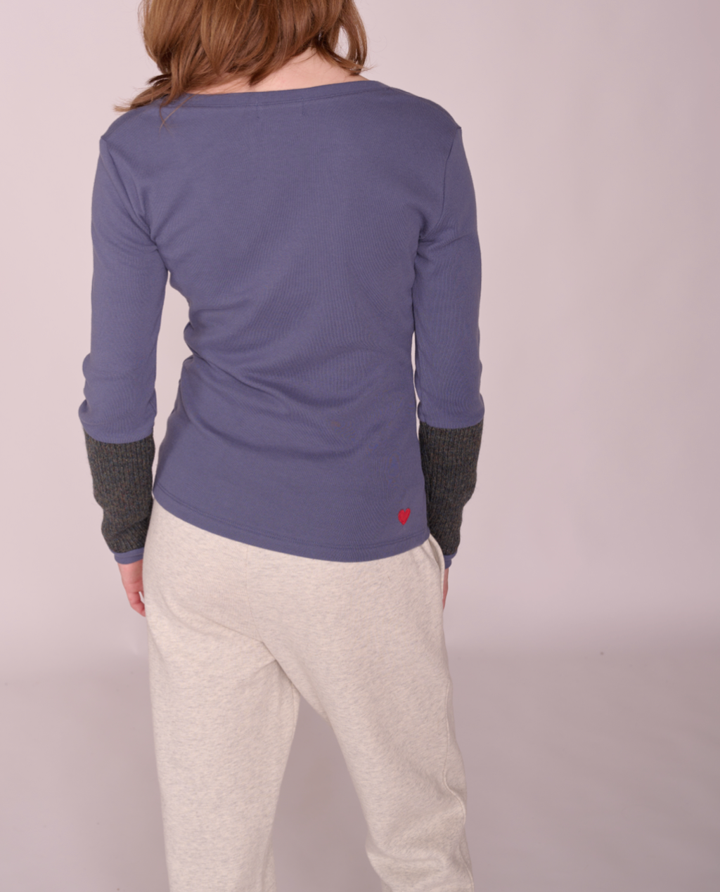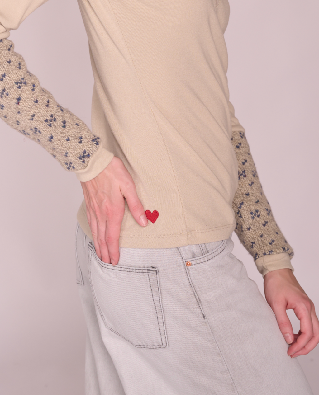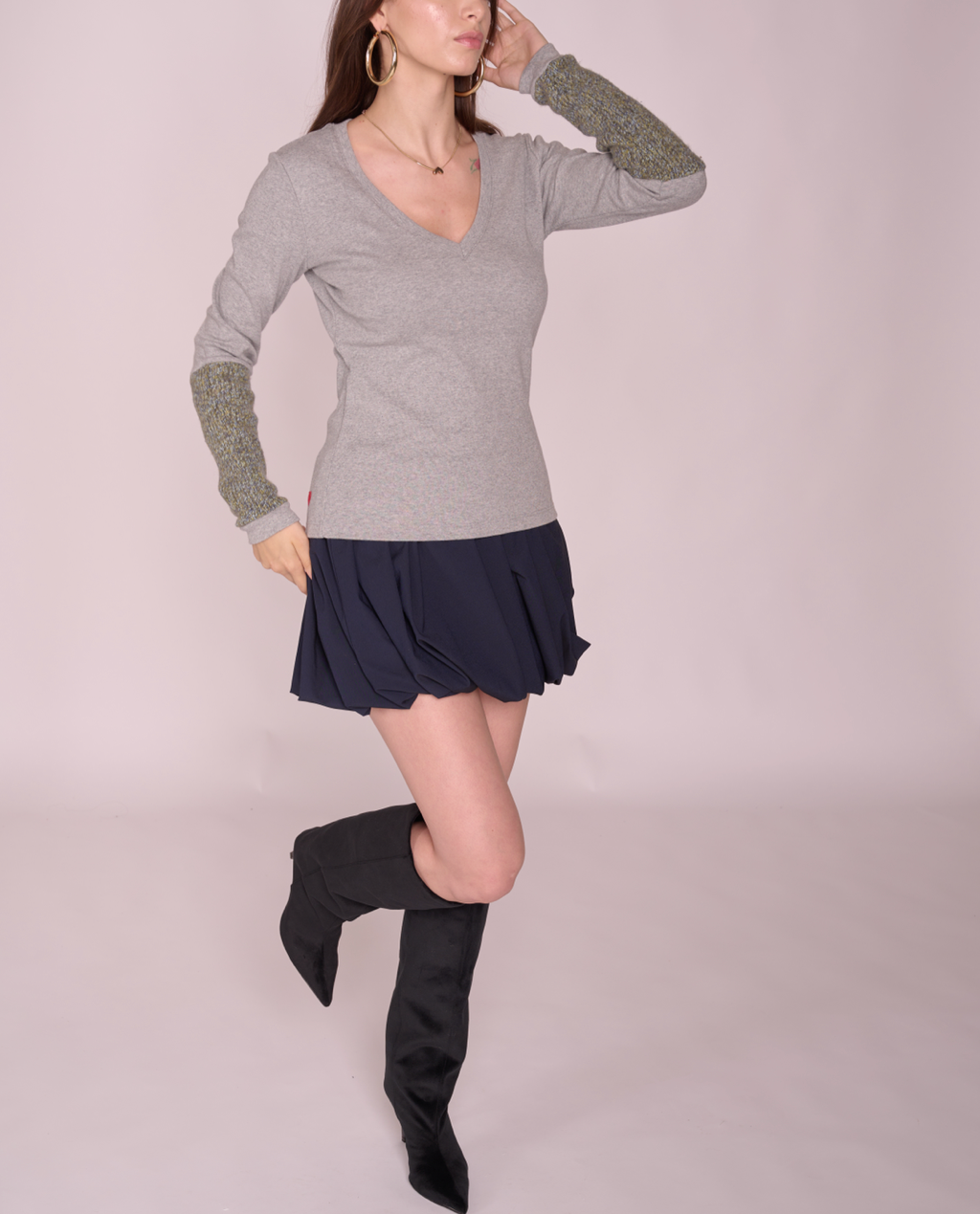 A pop of upcycled wool sweaters, turns this basic 100% cotton long sleeve v-neck top into a one-of-a-kind gem. Paired perfectly with a pair of jeans or a maxi skirt.