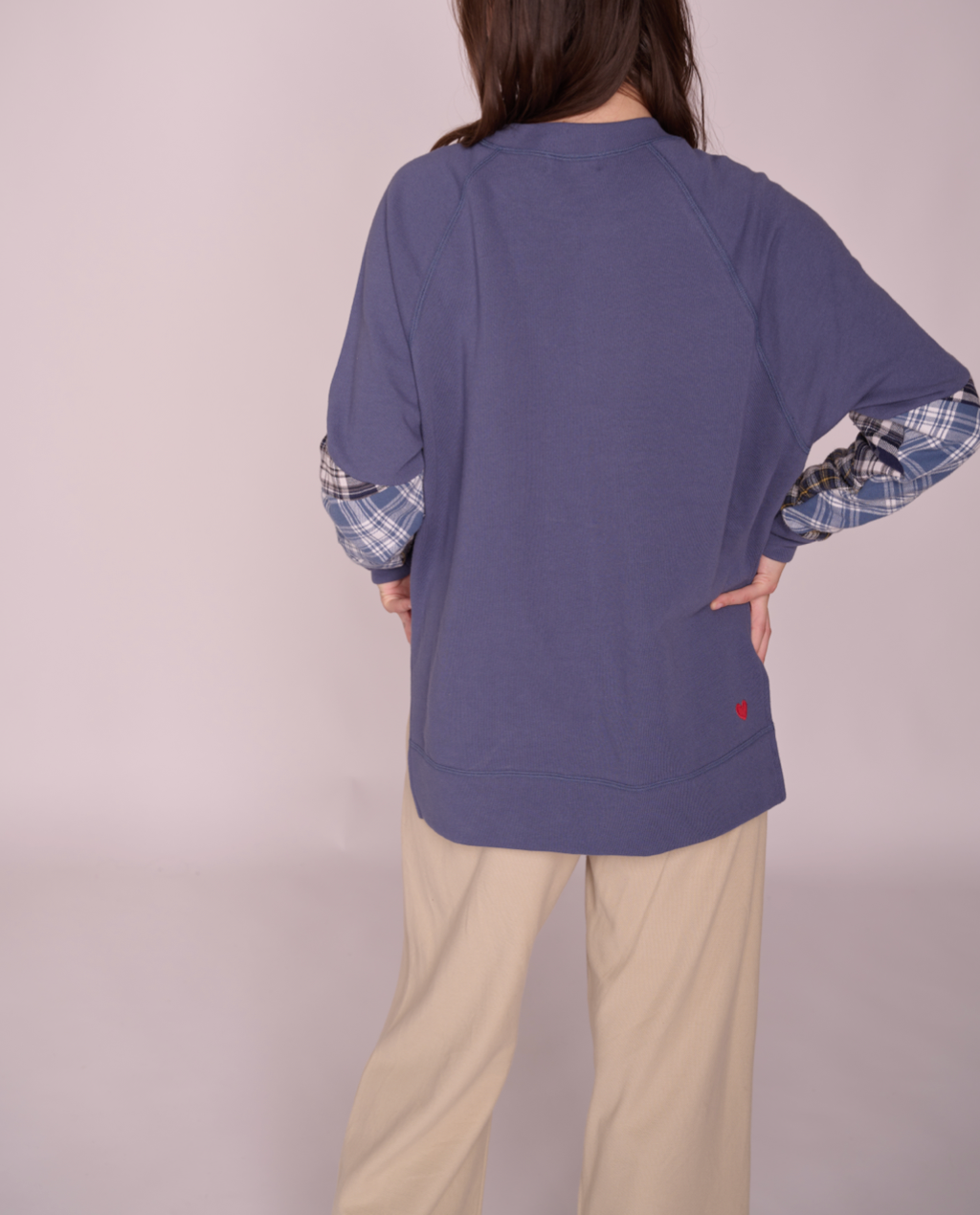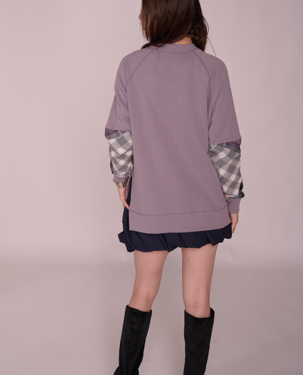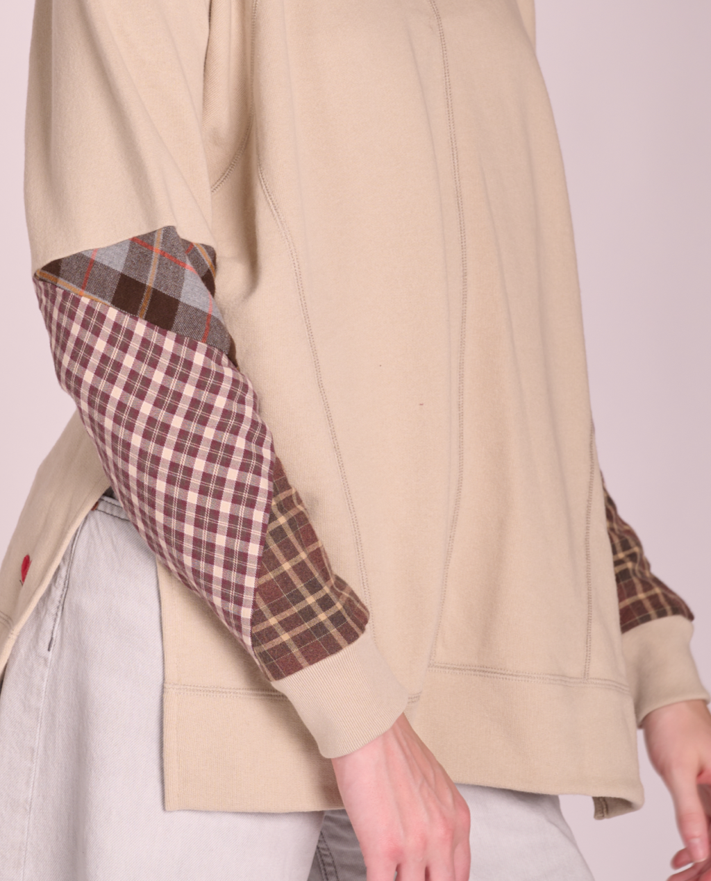 Mock neck sweatshirt featuring upcycled flannel panels on the sleeves, body has high slits. Made 100% cotton terry, for a soft lightweight feel.