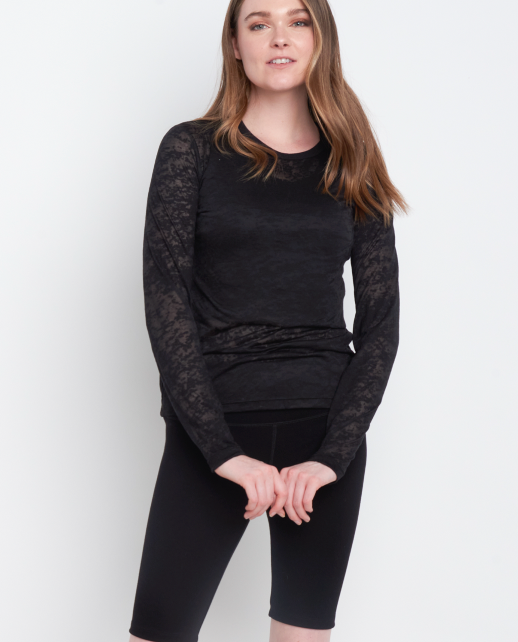 Lightweight, sheer crew neck long sleeve top, constructed from burnout design jersey with upcycled denim heart appliqué.